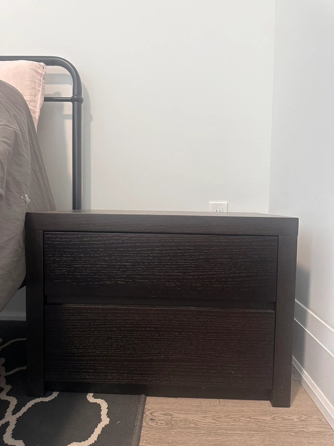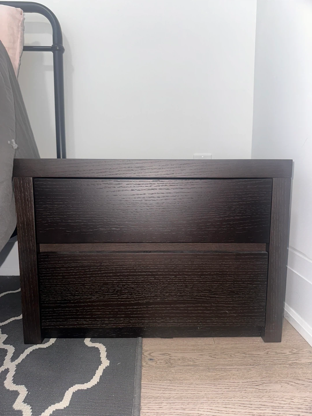 A simple dark brown nightstand with two drawers. It's made of wood and offers convenient bedside storage. Perfect for keeping your room tidy!