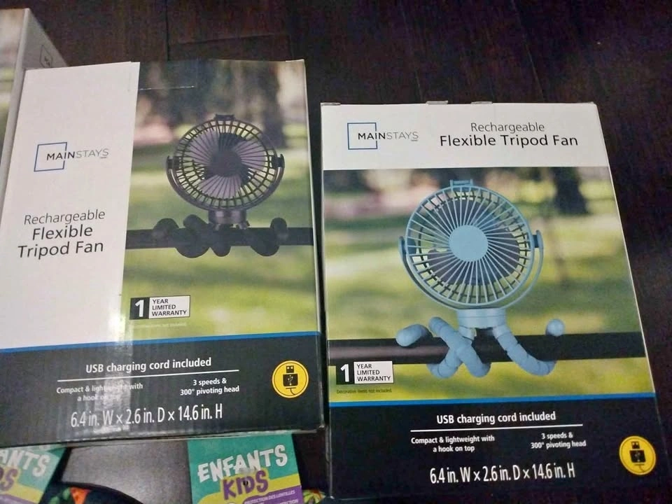 Brand new flexible rechargeable fan. Can stand on a table or wrap around bars like on a stroller or umbrella. Comes with USB charging cable. 7 left in blue. $10 each. Located in Derry & McLaughlin.