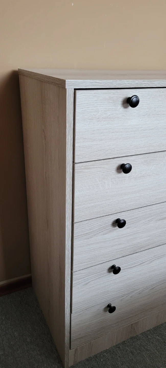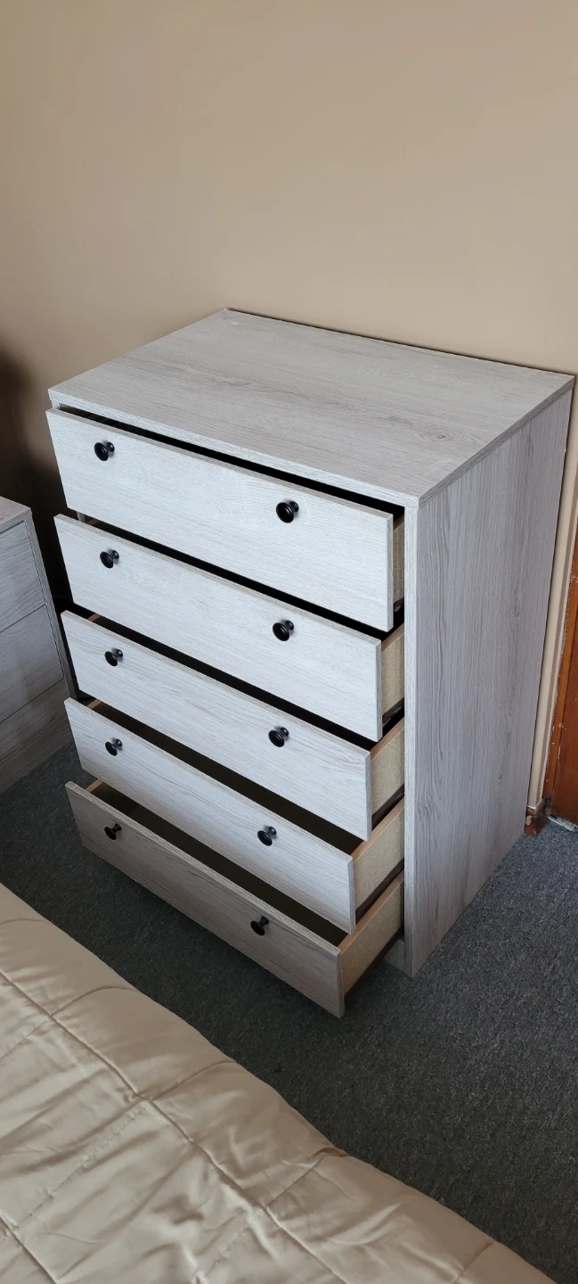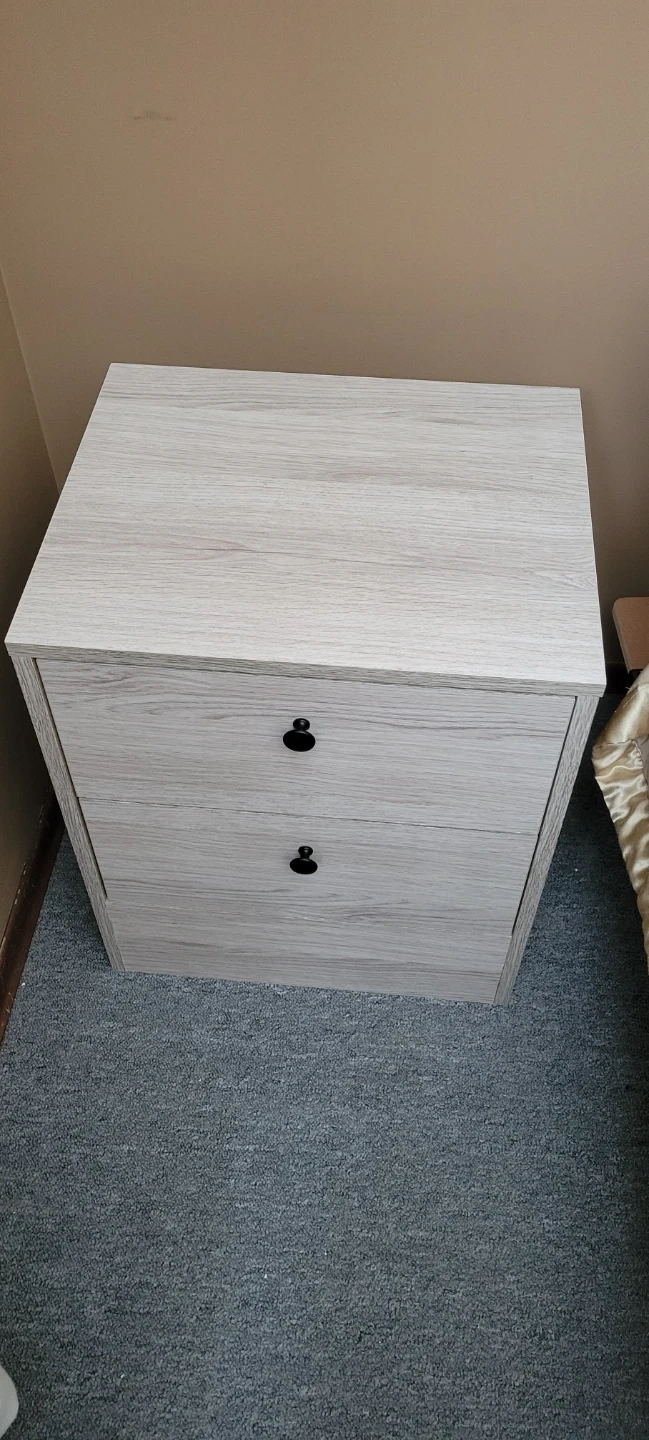This 2-drawer nightstand features a light wood grain finish and black hardware. It's perfect for storing bedside essentials. A matching 5-drawer dresser is also available, all in the same color/ look barely used