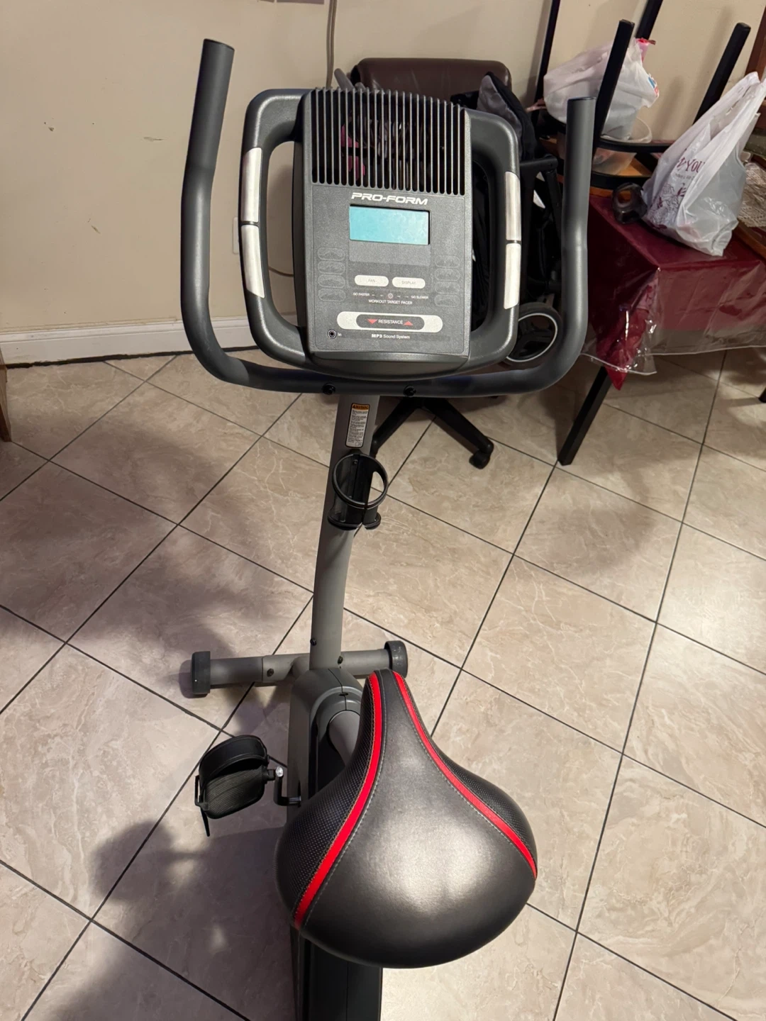 This is a ProForm upright exercise bike. It features a digital display for workout metrics. The seat is adjustable and padded for comfort. It's a great way to get a cardio workout at home!
