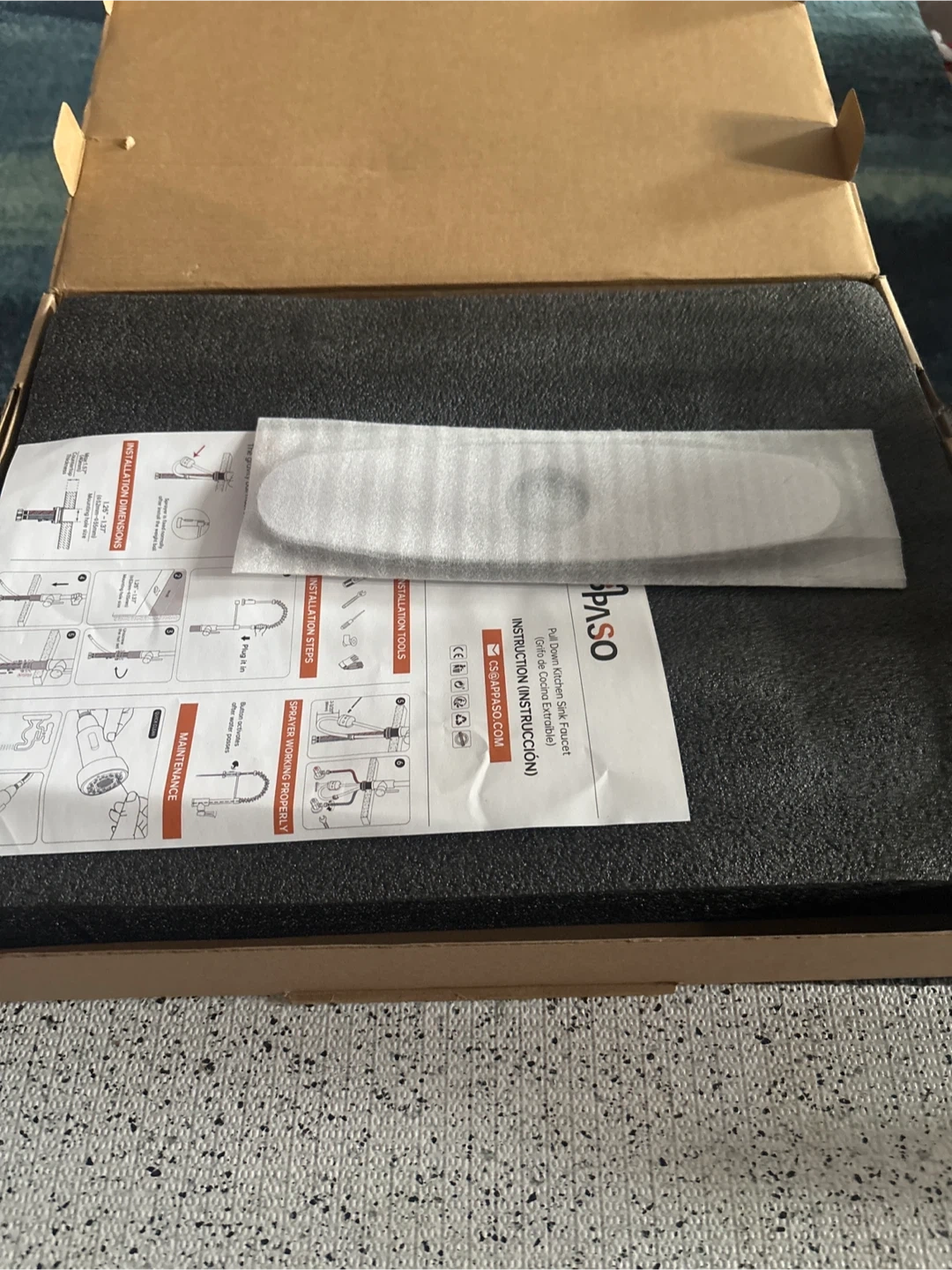 This is a black pull-down kitchen faucet from Ponsol. It includes the faucet, pull-down hose, and mounting hardware. Installation instructions are also provided.