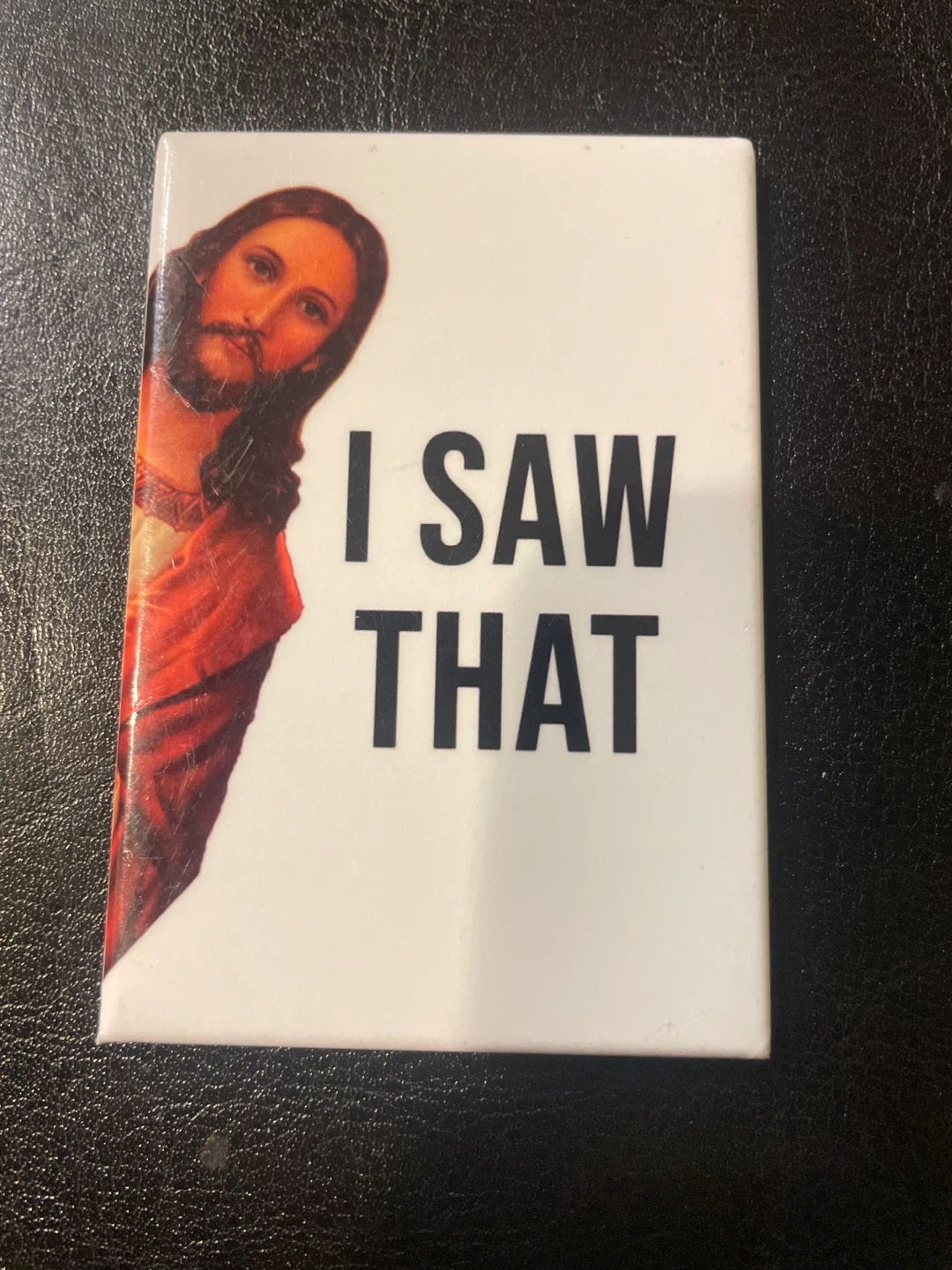 This is a fun magnet with the "I Saw That" meme featuring Jesus. It's a great conversation starter for your fridge or any magnetic surface. The magnet is new and ready to add some humour to your space!