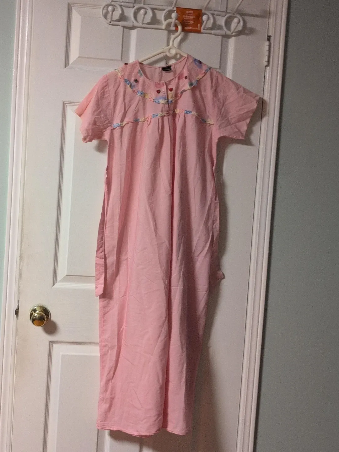 This pink nightgown has short sleeves and a ruffled, embroidered collar. It features a button-up front with three small buttons. It's made of a lightweight cotton blend.