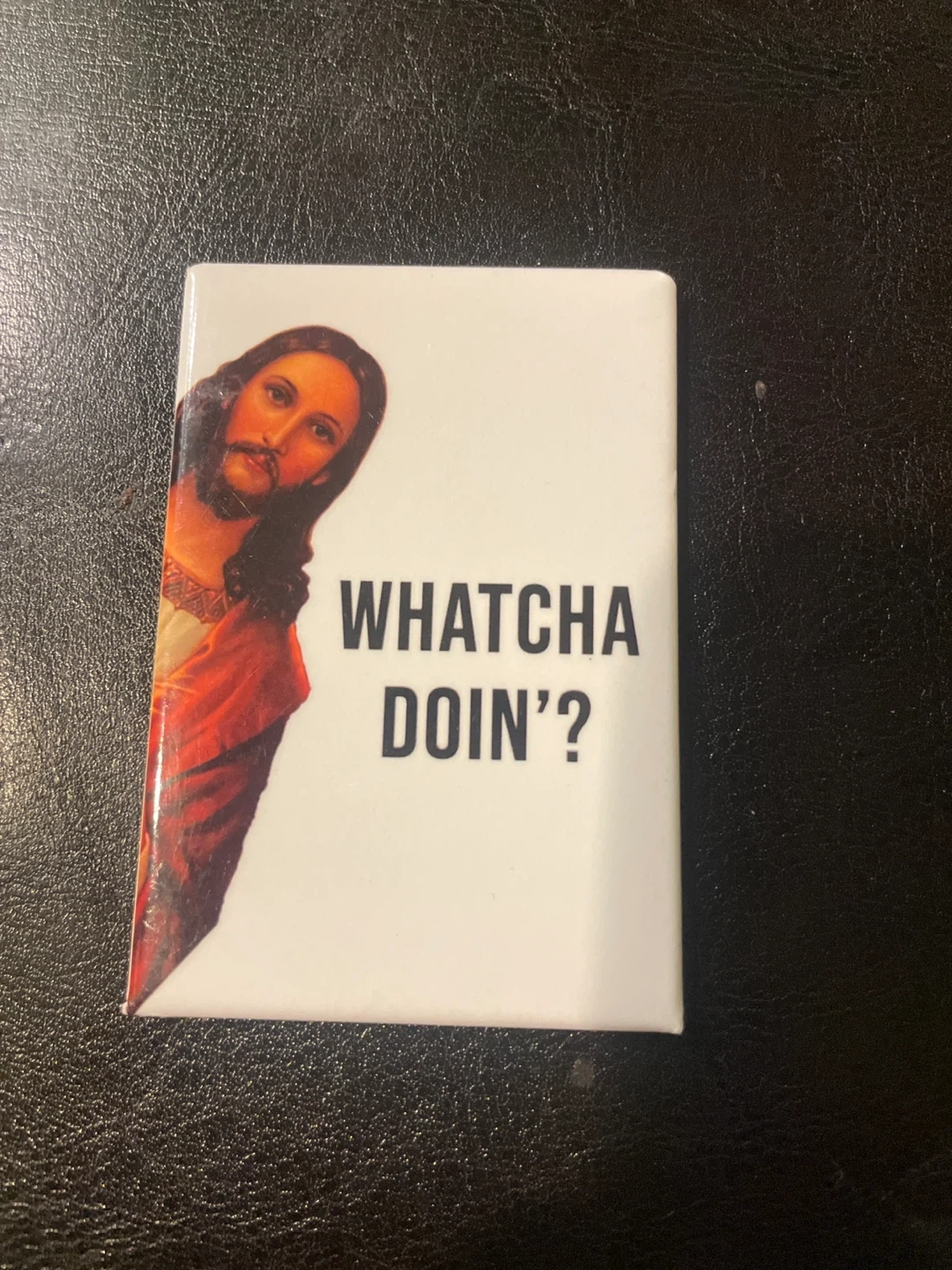 This is a funny magnet featuring Jesus asking 'Whatcha Doin?'. It's a great way to add some humour to your fridge or any magnetic surface. The magnet is new and measures approximately 2.5 inches by 3.5 inches. Perfect for anyone who enjoys meme culture or a good laugh!