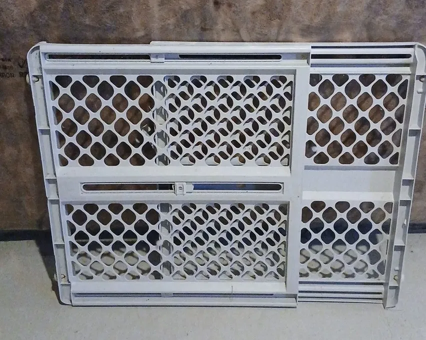 This is a white plastic gate, suitable for pets or babies. It features a sturdy plastic construction with a patterned mesh. The gate is designed for safety and containment.