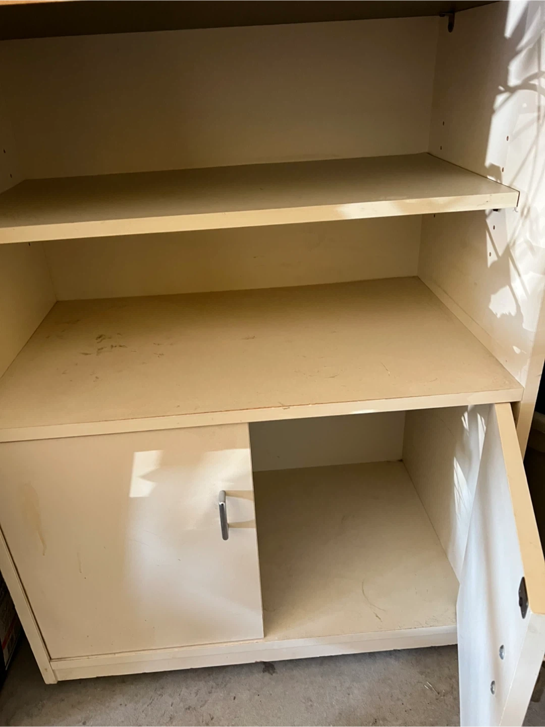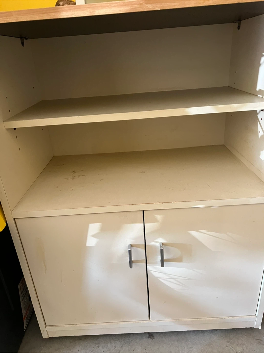 This is a cream coloured cabinet. It has two shelves and two doors at the bottom. It offers good storage space.