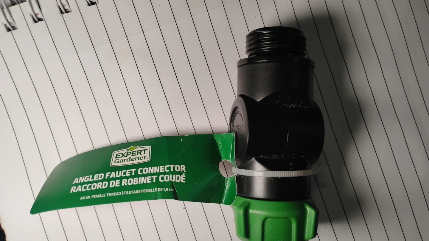 This is an Expert Gardener angled faucet connector. It features a 3/4 inch female thread. This connector helps redirect water flow from your faucet.
