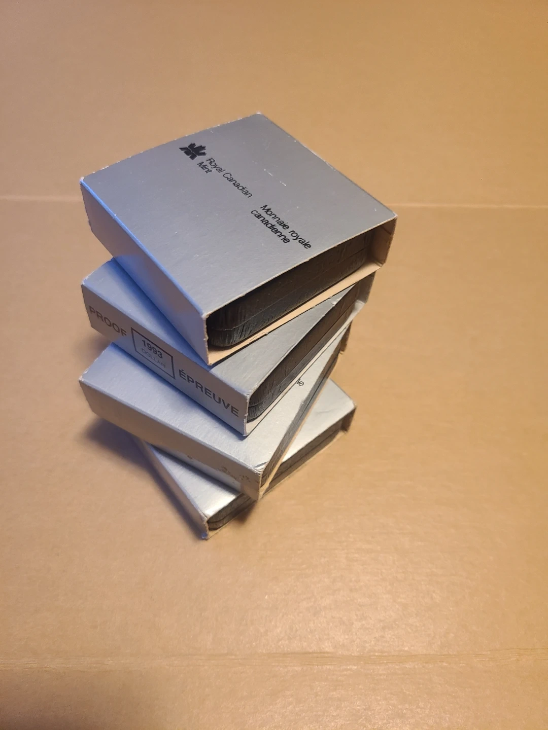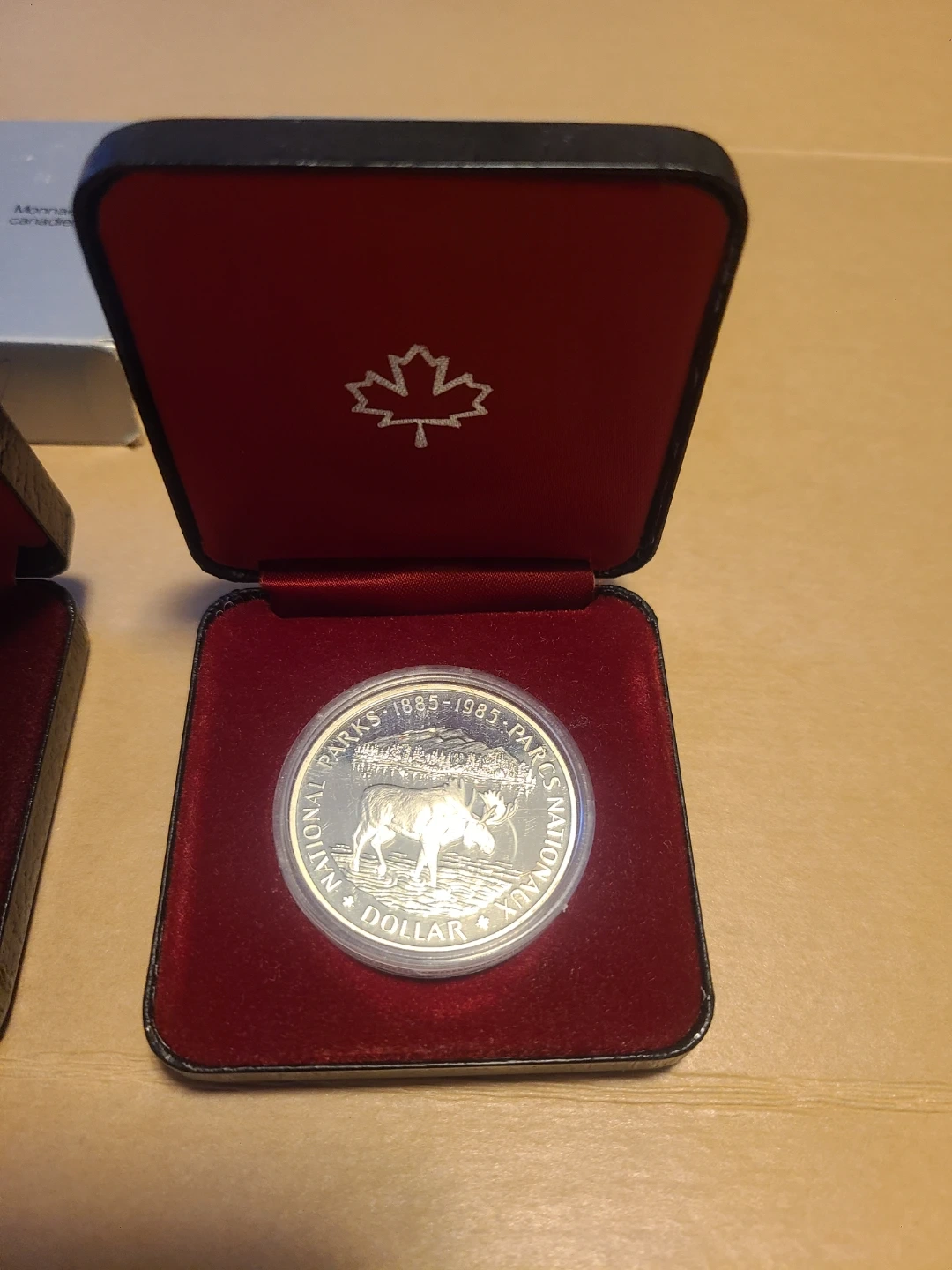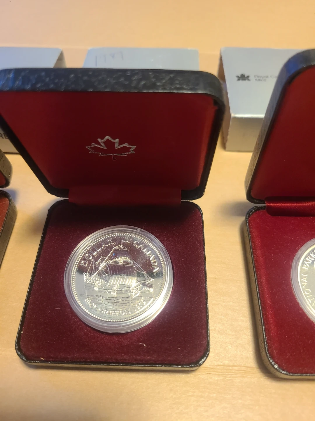 A collection of Royal Canadian Mint proof Silver Dollar coins, presented in their original display. The cases themselves are red velvet lined with a protective sleeve for each coin. The content of silver in each coin is .500. For those who want to pay next to nothing or those who want to know the "lowest" or the "best" price, the answer is $45/each coin.