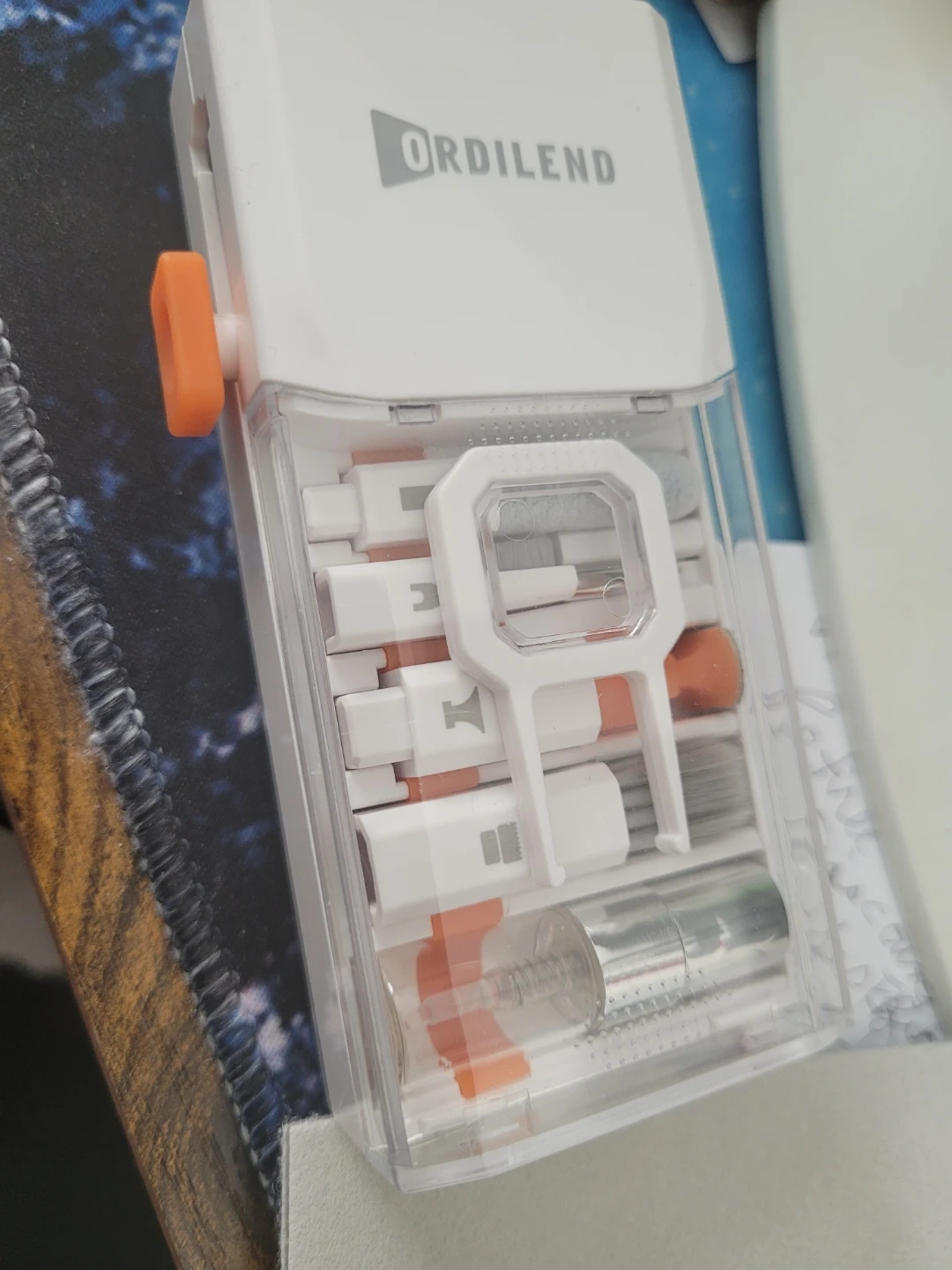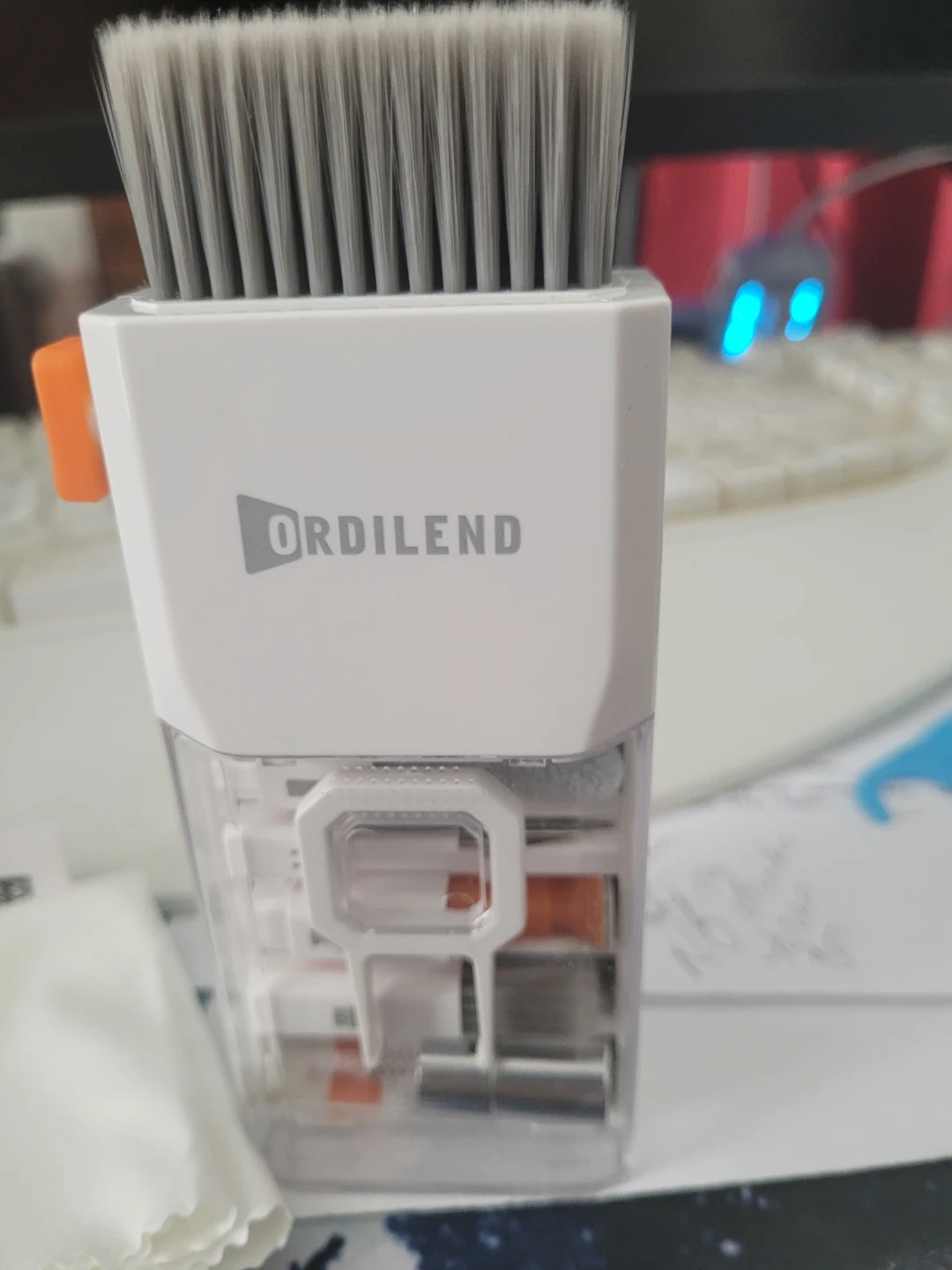 This Ordilend cleaning kit is perfect for keeping your electronics tidy. It includes a metal pen tip, flocking sponge, thin brush, and soft plastic lens cleaner for mobile phones, earphones, keyboards, and more. Keep your devices looking sharp and clean!