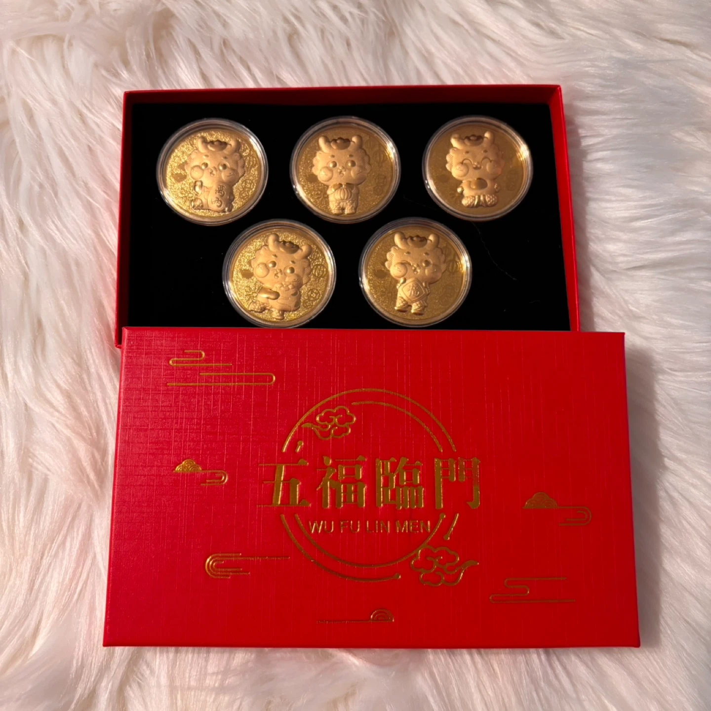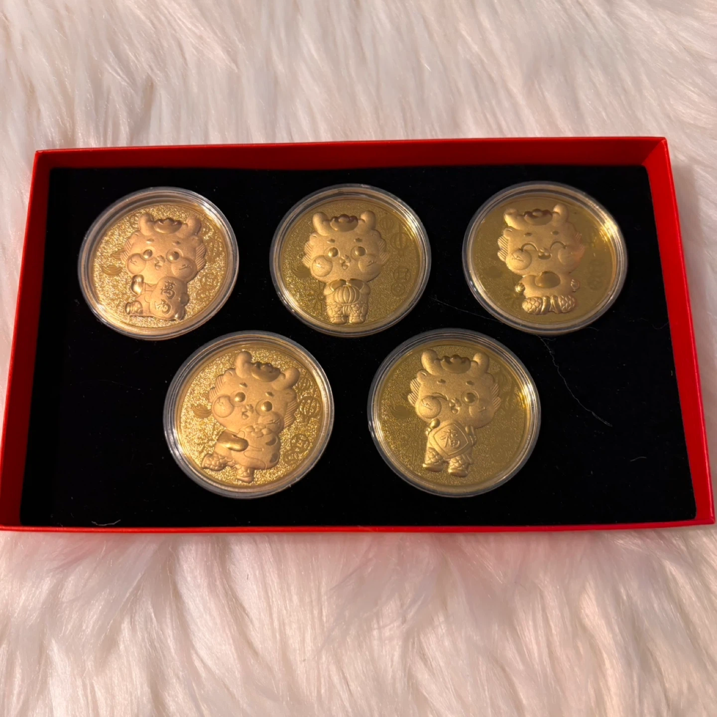 This set includes five gold-coloured coins, each featuring a unique cartoon character design. They come presented in a decorative red box, ready for gifting or display. These coins are a fun collectible item!