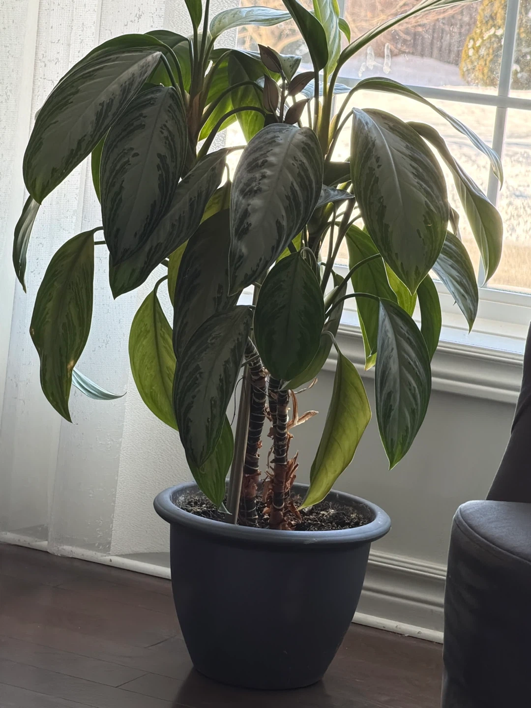 This is a healthy Aglaonema plant in a dark grey pot. It features lush green leaves with distinctive silver markings. The plant is well-established and ready for a new home.