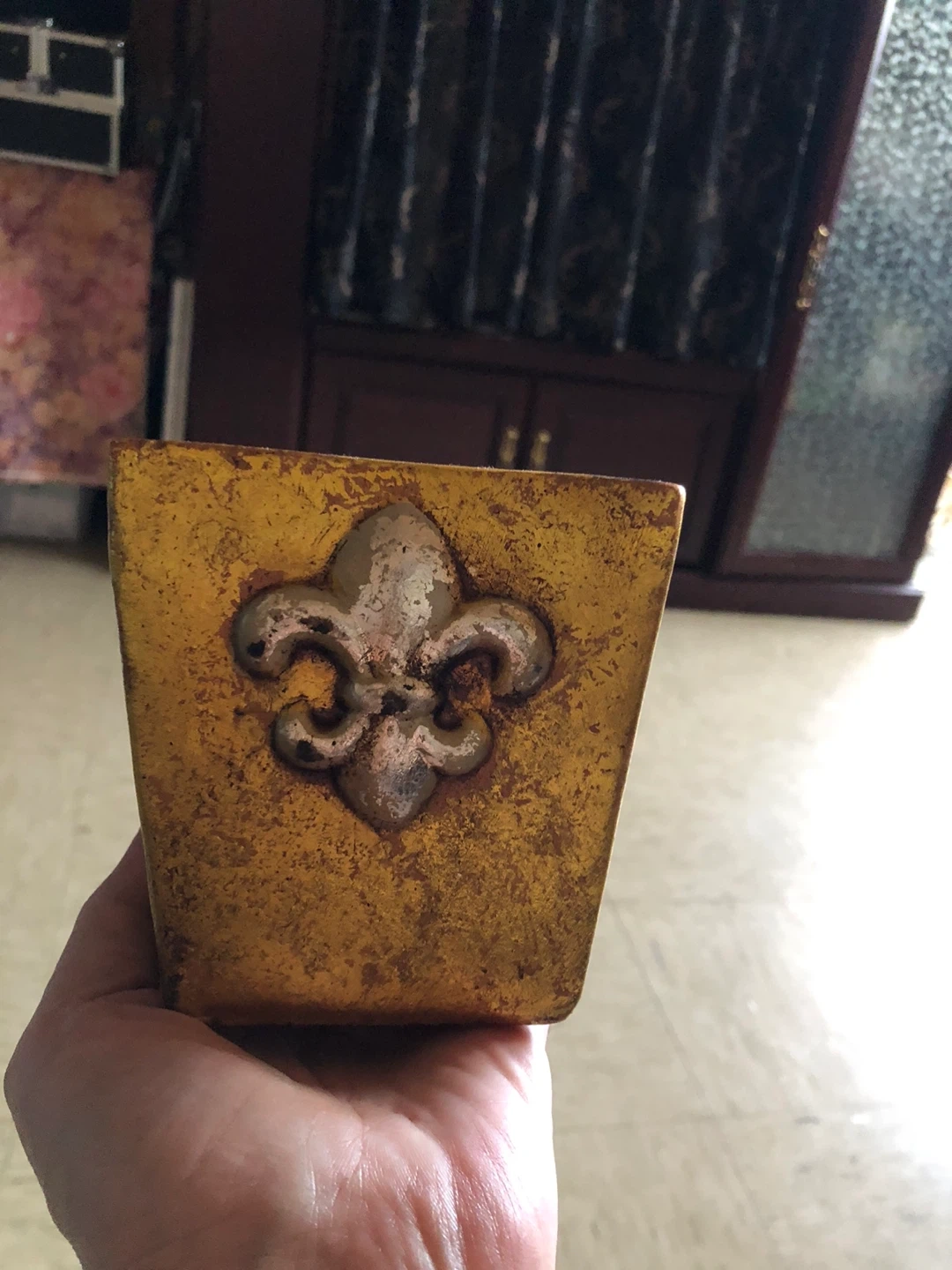 This decorative candle holder features a distressed gold finish and a raised fleur-de-lis emblem on the front. It holds a single pillar candle. Some minor wear is visible on the corners, but it's still a lovely piece for your home decor!