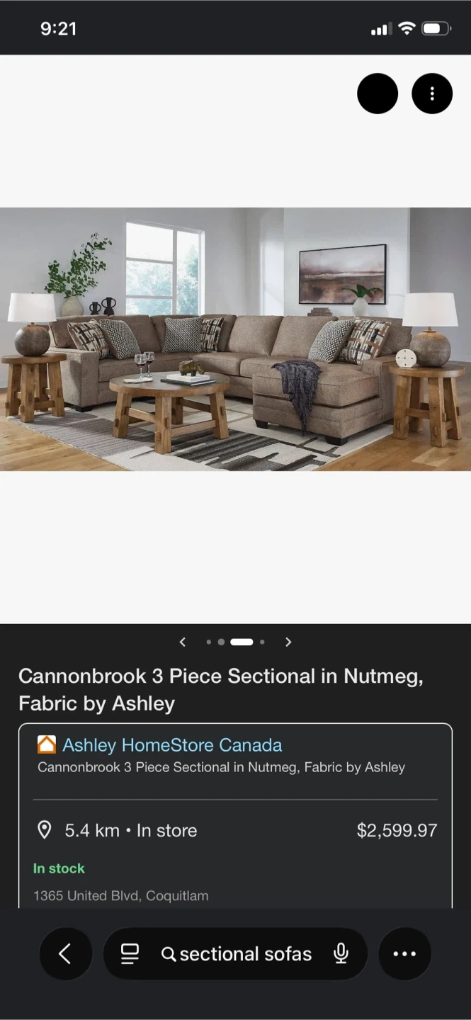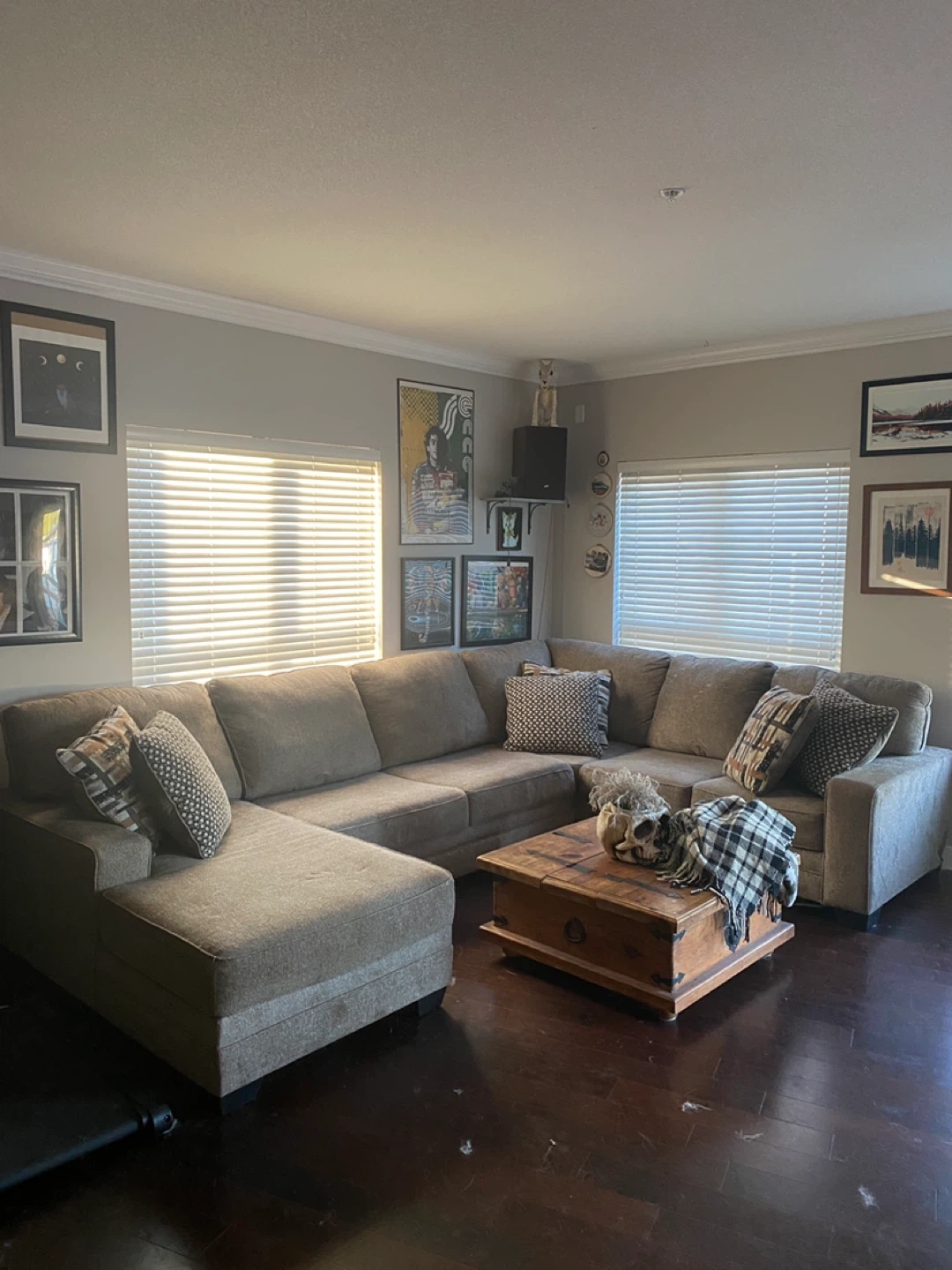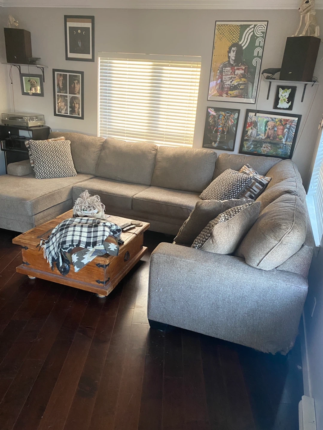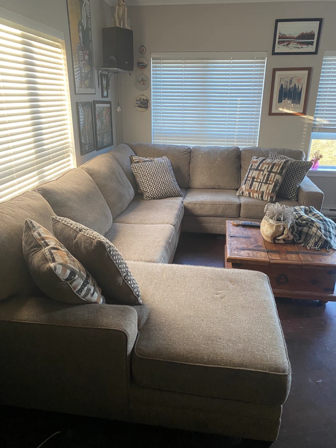 Comfortable fabric sectional sofa in a neutral brown tone. It features a chaise lounge for extra relaxation. Includes several throw pillows for added style and comfort. This spacious sofa is great for family gatherings or movie nights.