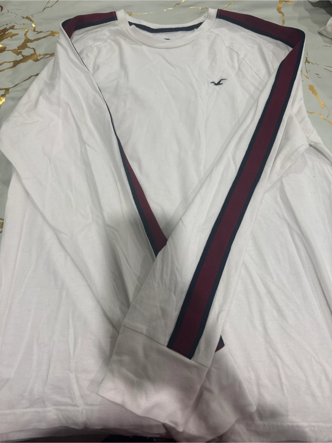 This is a white long-sleeve t-shirt from Hollister California. It features a navy and maroon stripe detail on the sleeves. Made in Vietnam. Size is large.