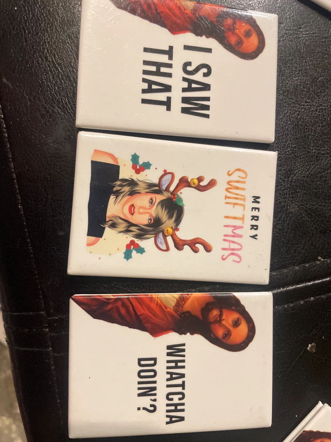 These are three rectangular magnets with humorous Christmas-themed designs. One features Taylor Swift with reindeer antlers and the text "Merry Swiftmas." Another shows Jesus and the text "Whatcha Doin'?" The third has the text "I Saw That" with a stylized image. They're great for adding a bit of fun to your fridge!