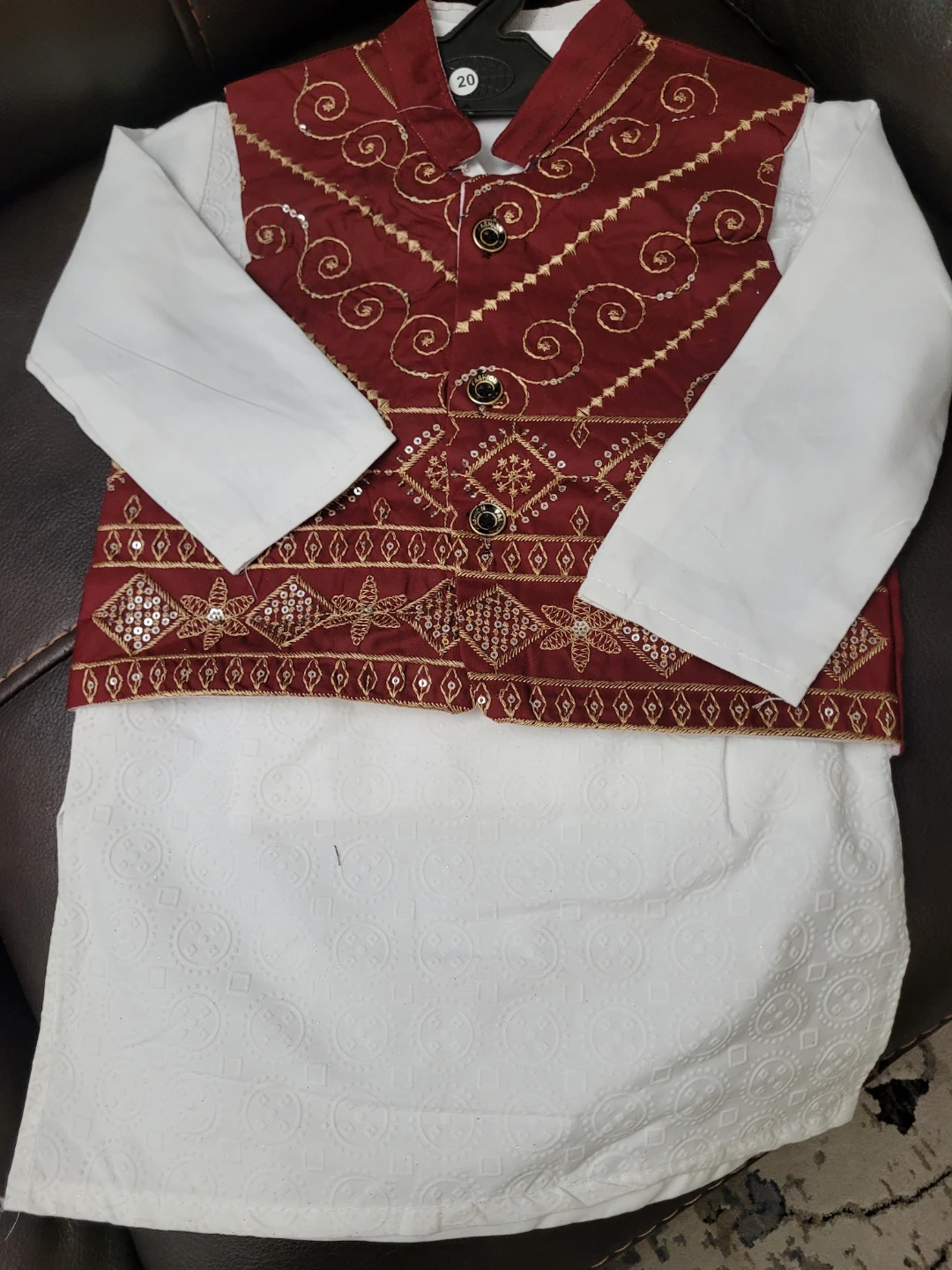 A charming kurta and waistcoat set for kids. The kurta is white with a subtle embossed pattern. It's paired with a maroon waistcoat featuring intricate gold embroidery and sequin accents. Includes matching buttons. Size 20.
