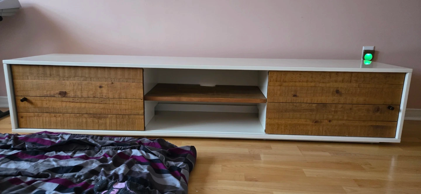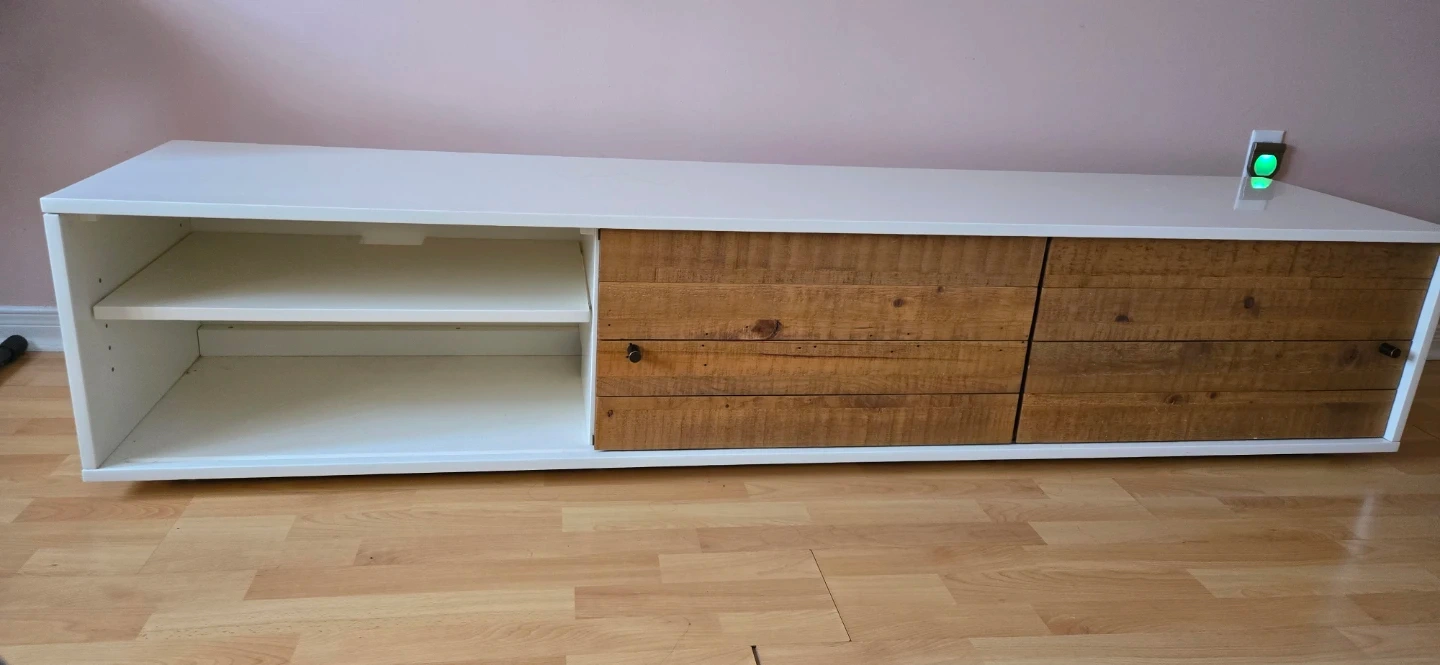 White TV Stand with Rustic Wood Doors