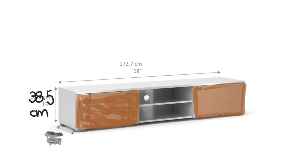 This TV stand measures 172.7 cm (68") long, 38.5 cm (15.1") high, and 40 cm (15.7") deep. It has white cabinetry with two rustic wooden sliding doors and open shelving in the centre. This unit is great for storing media consoles and organizing electronics.