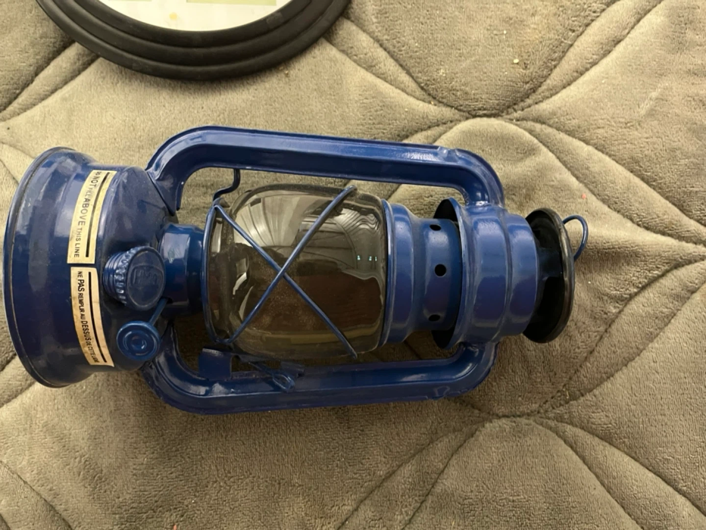 This is a blue oil lantern with a glass globe. It's made of metal and features a sturdy handle for carrying. It's great for outdoor activities or as a decorative piece.