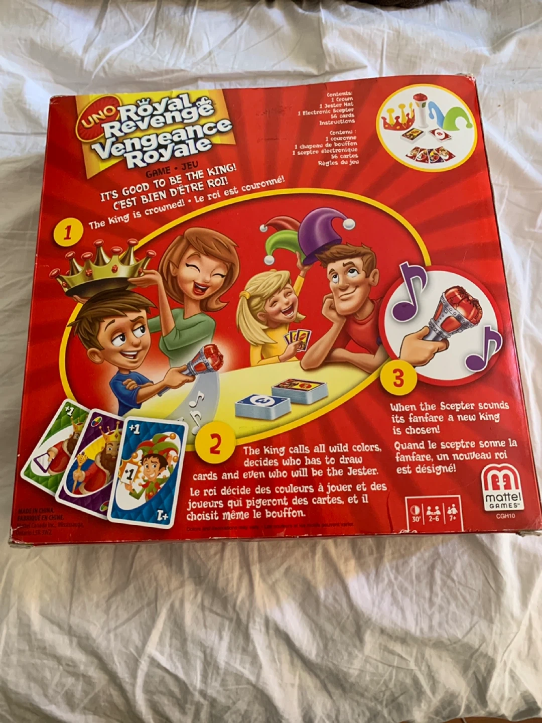 UNO Royal Vengeance Royale board game by Mattel Games. Includes 1 Crown, 1 Jester Hat, 1 Electronic Scepter, 56 cards, and instructions. Suitable for 2-6 players, ages 7+.