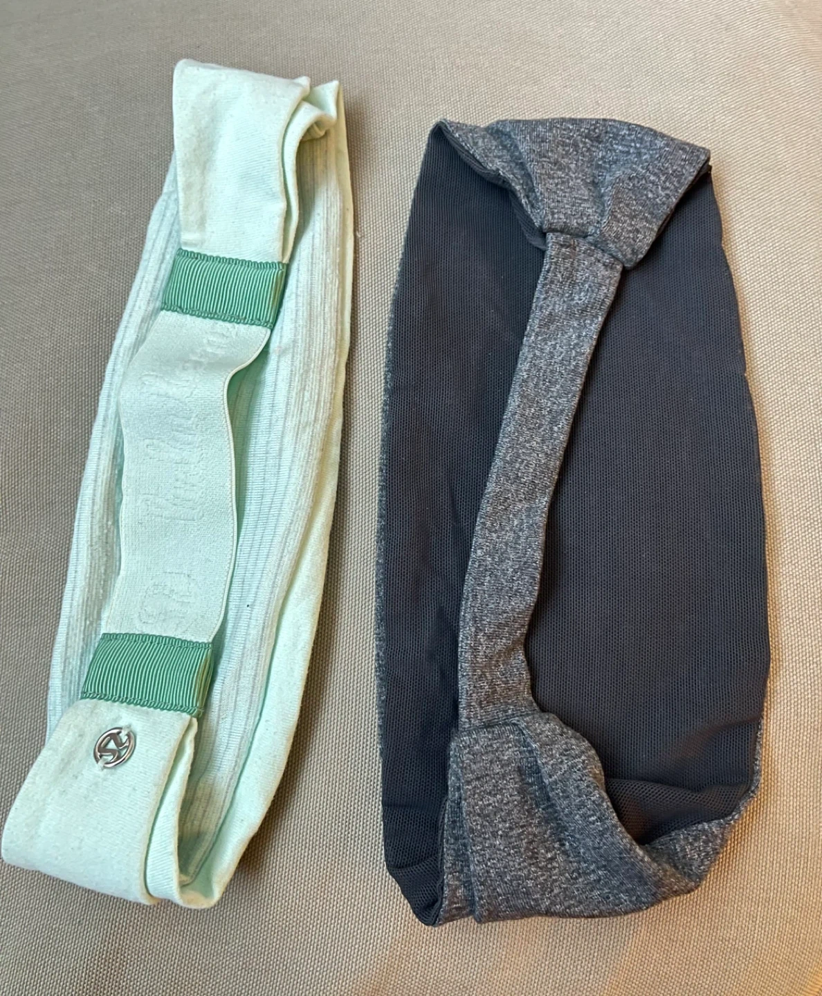 Two Lululemon headbands in different colours. One is light mint green with green accents, and the other is heathered grey. They're made of comfortable, stretchy fabric.