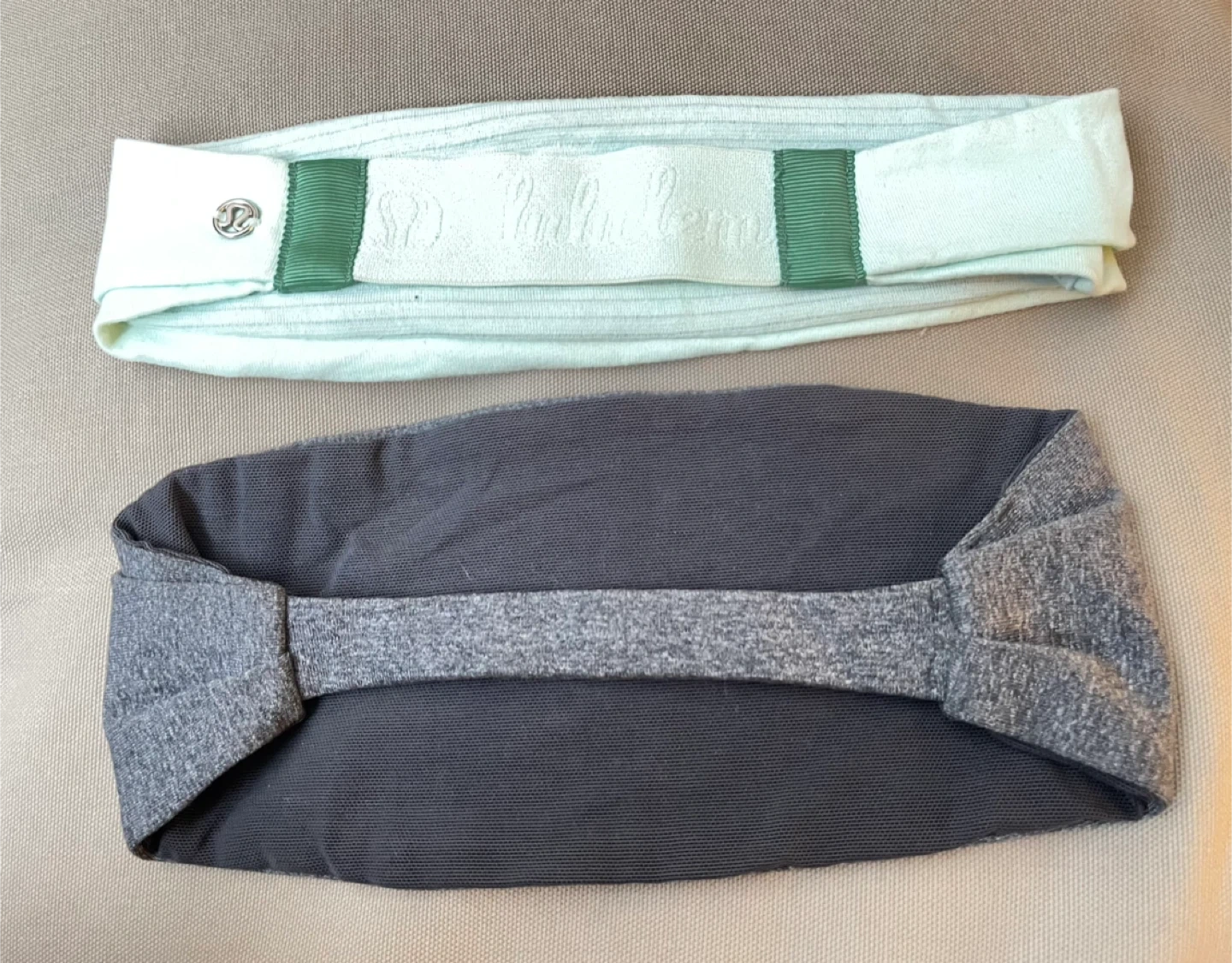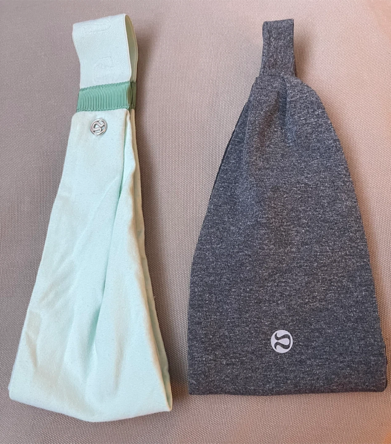 Two Lululemon headbands in different colours. One is light mint green with green accents, and the other is heathered grey. They're made of comfortable, stretchy fabric.