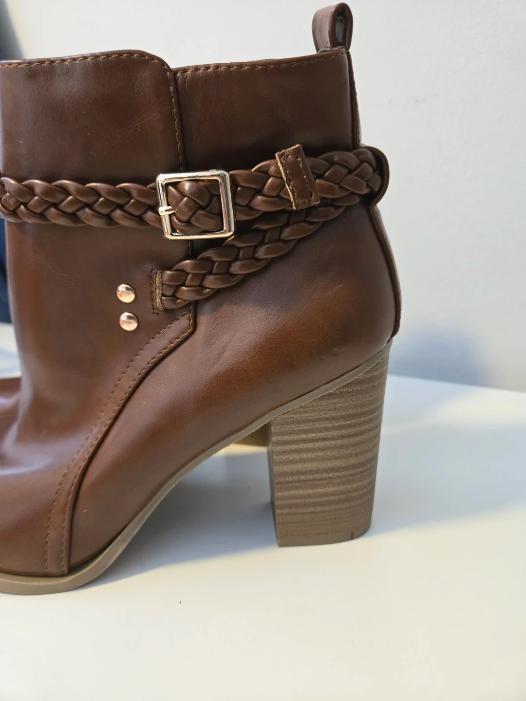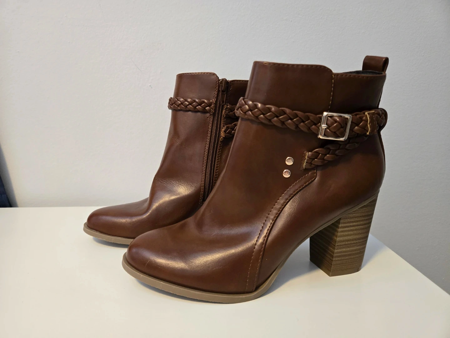 These are stylish brown ankle boots from American Eagle. They feature a braided strap detail with a buckle closure. The block heel offers a comfortable lift.