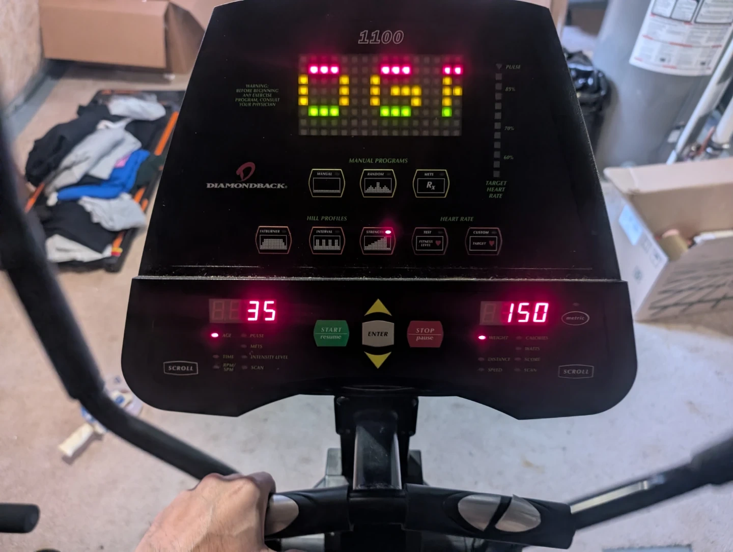 This is a Diamondback 1100EL elliptical machine. It has multiple manual programs and a heart rate monitor. The display shows time, distance, speed, and calories burned.