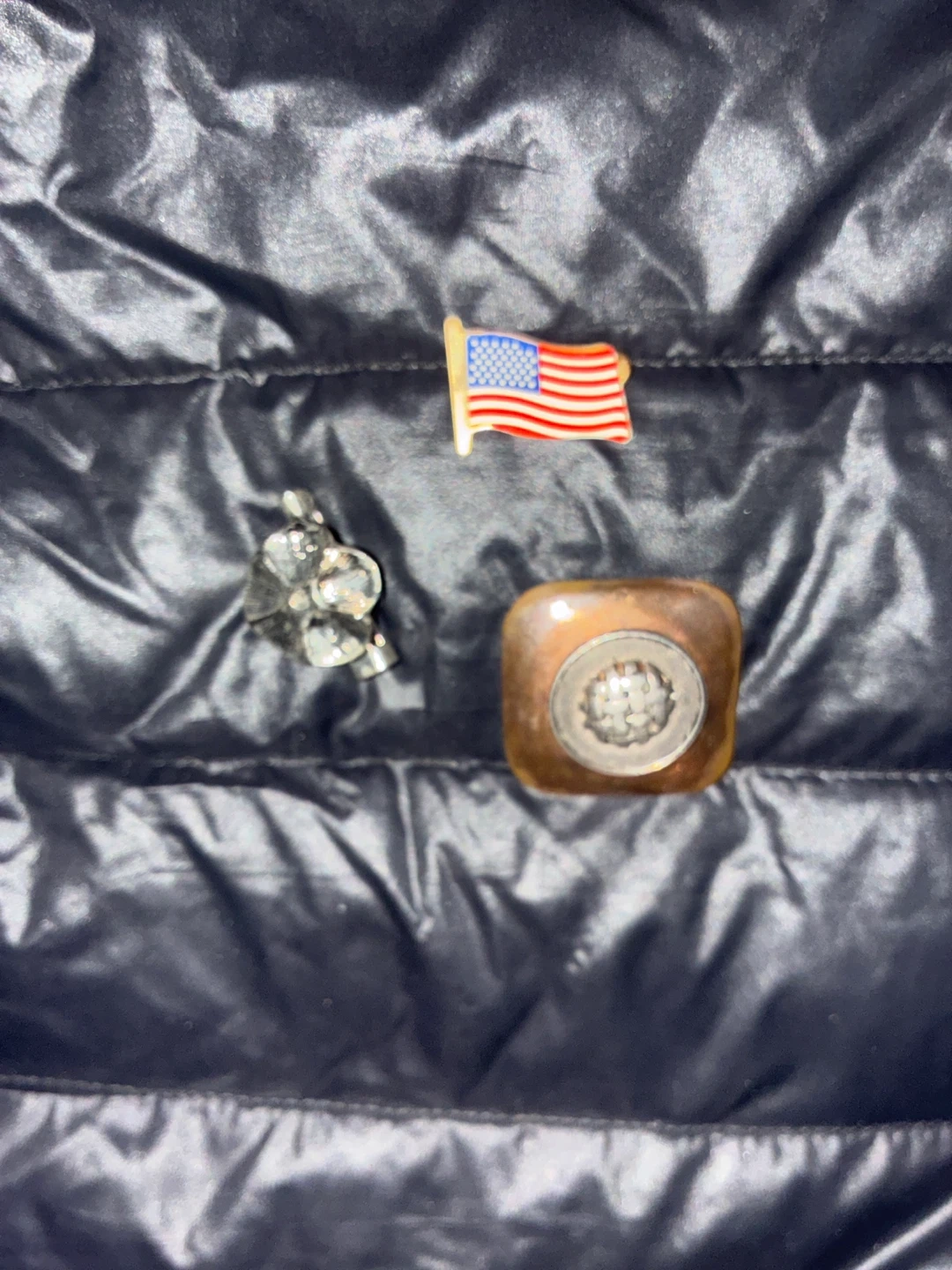 Free items ! Includes a small US flag pin, a silver-toned flower-shaped pin, and a unique metal square pin with an ornate center design. These pins appear to be vintage items, perfect for collectors or adding a unique touch to apparel.