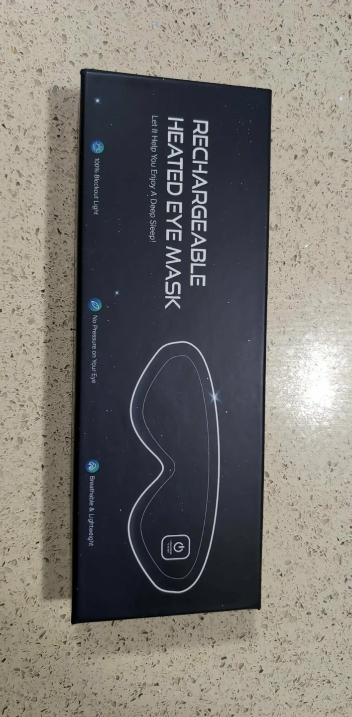 This is a rechargeable heated eye mask. It offers 100% blockout light for better sleep. The mask is breathable and lightweight with no pressure on your eyes.