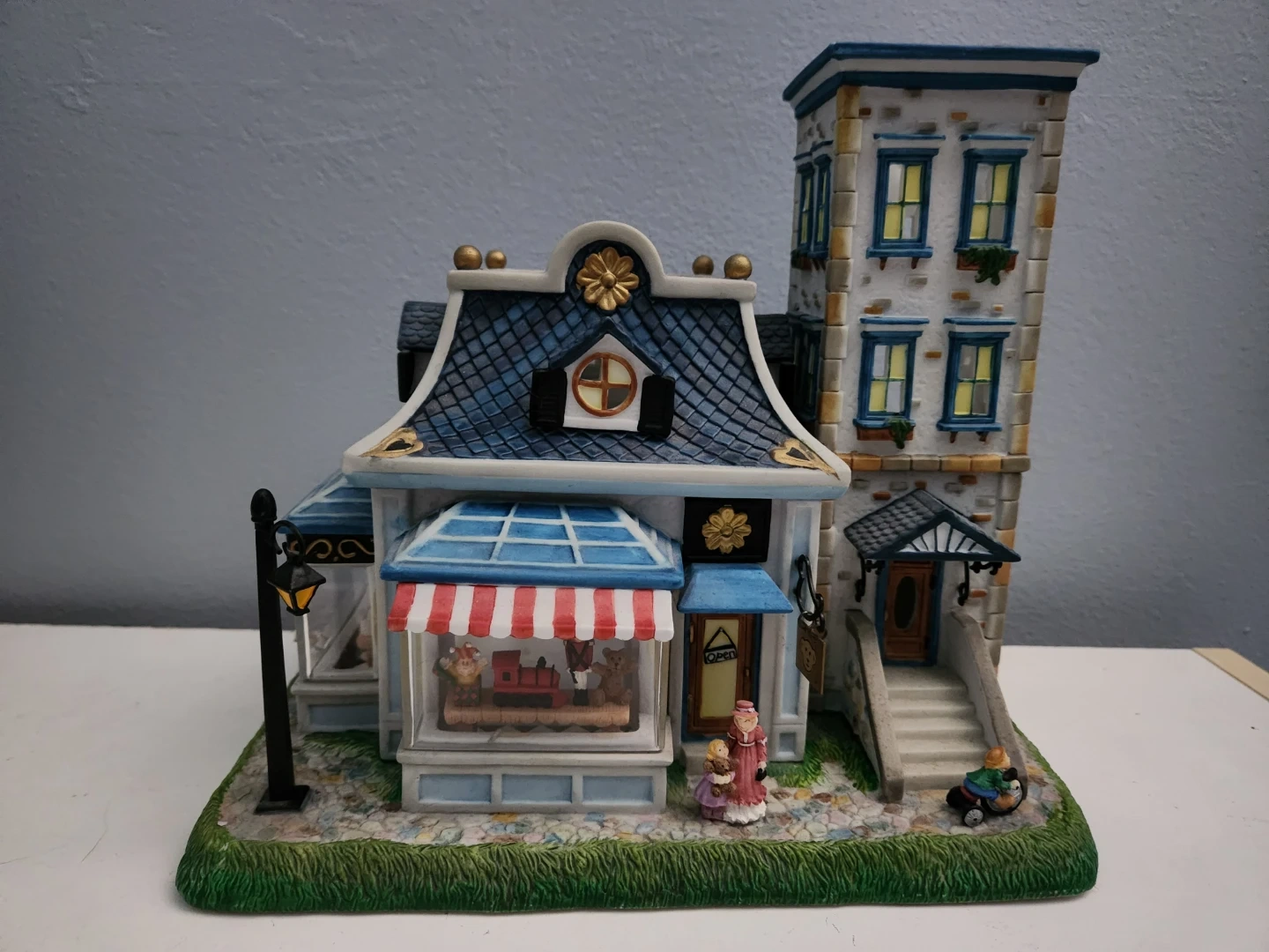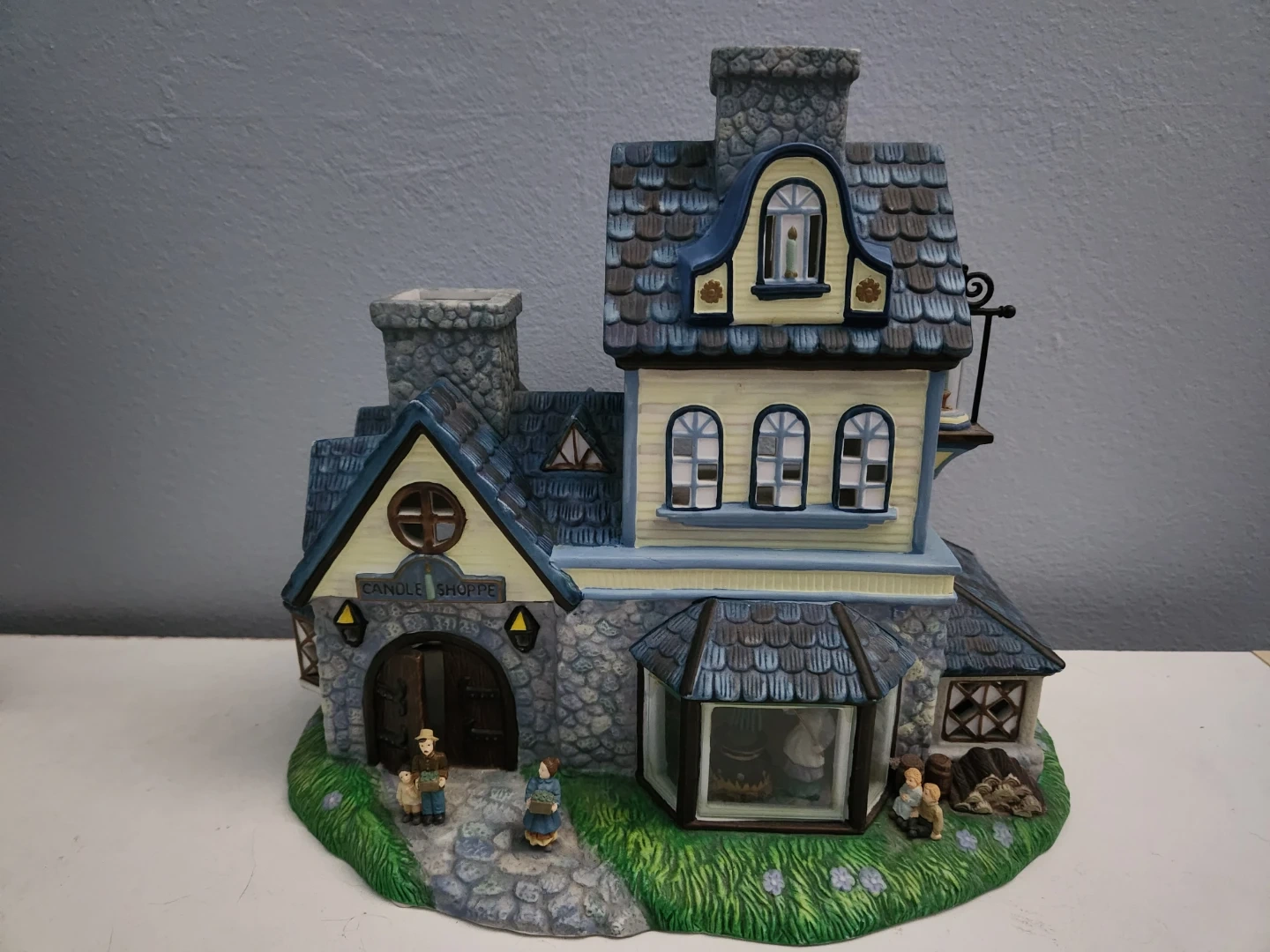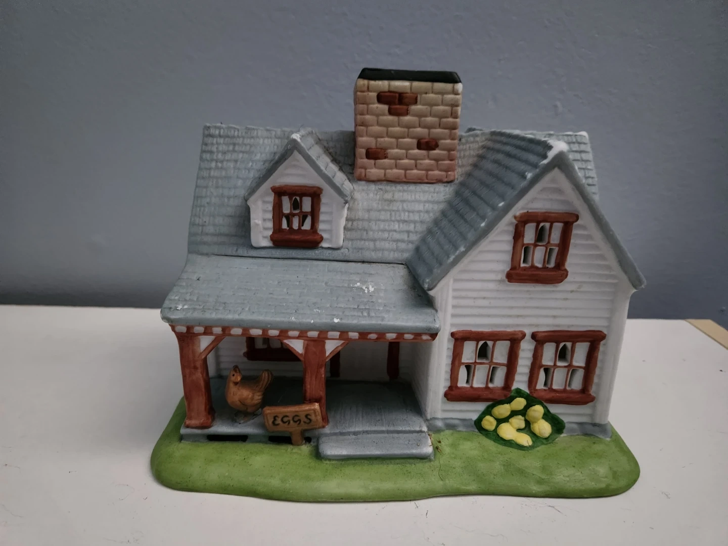 This is a collection of Partylite decorative ceramic tealight village houses. It includes a large stone house with a balcony, a quaint shop with figures and a lamp post, a charming church with stained glass details, a rustic farmhouse with a chicken and an 'EGGS' sign, and a building labelled 'Candle Shoppe'. These pieces are great for display during holidays or as year-round decor. Asking $25 each or $100 for all.