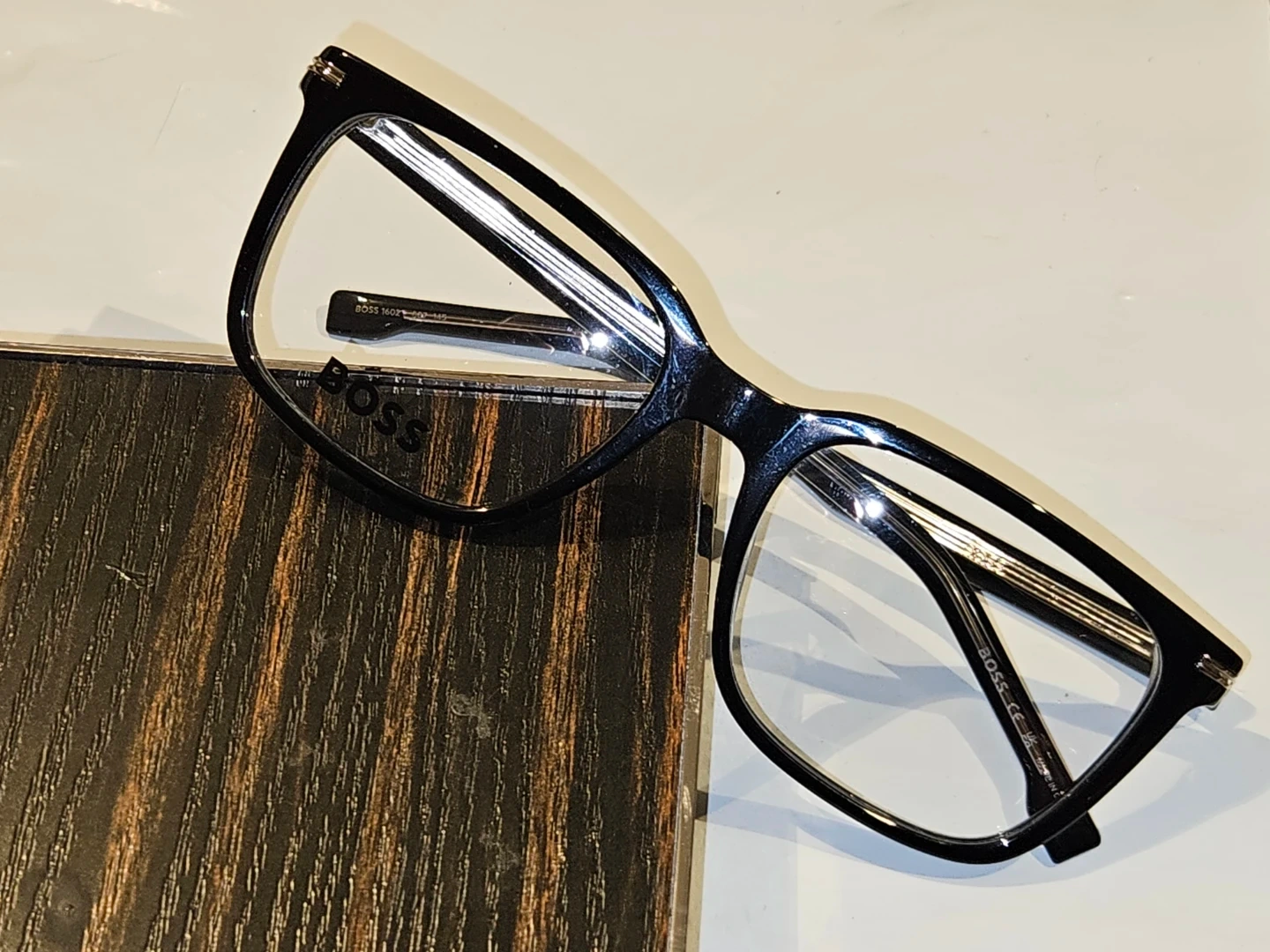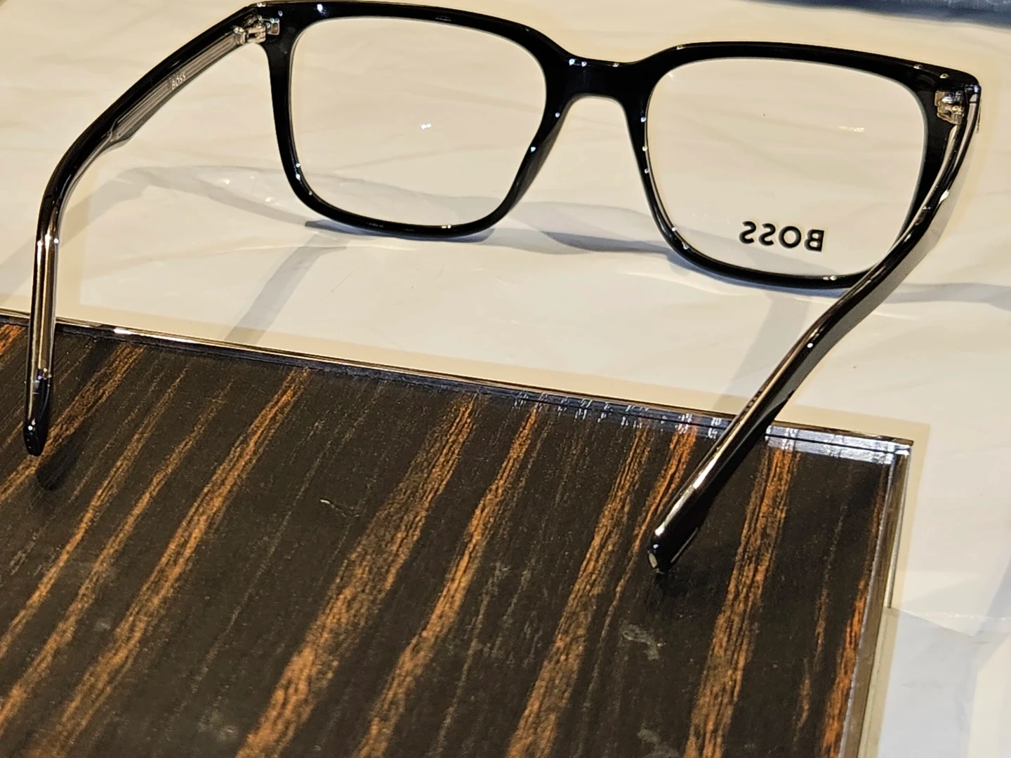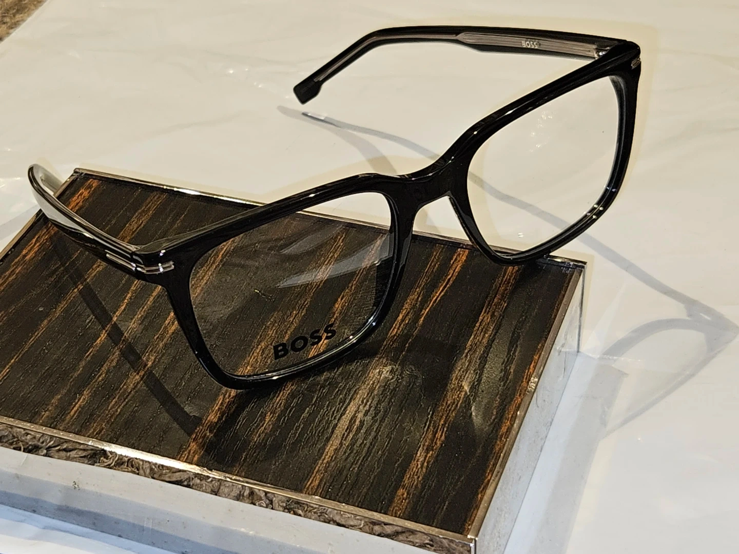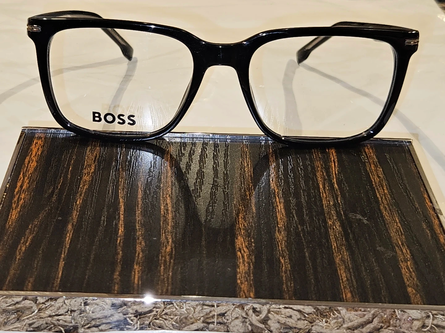 These are black BOSS eyeglasses. They feature a rectangular frame design. It's a stylish choice for everyday wear designed to perform any type of Prescription lenses.