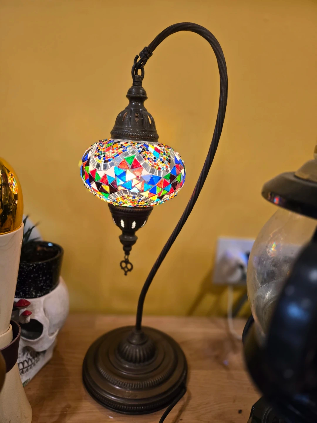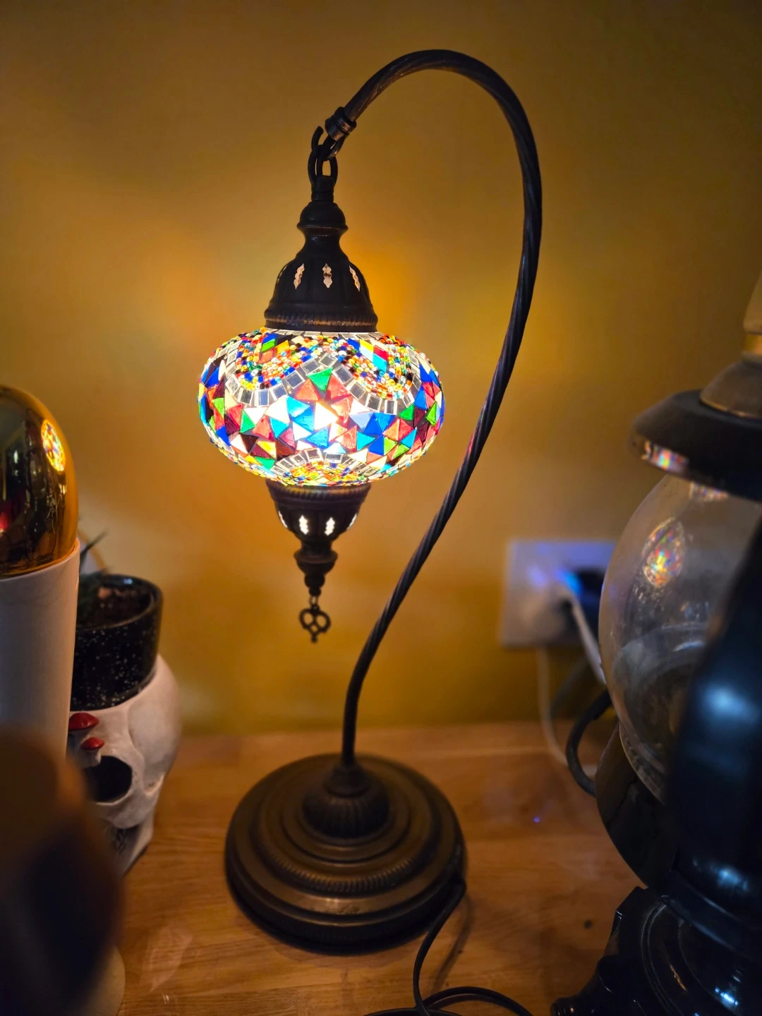 This is a beautiful mosaic turkish glass table lamp with a curved metal stand. It casts a colourful, ambient glow when lit. It's perfect for adding a decorative touch to any room.