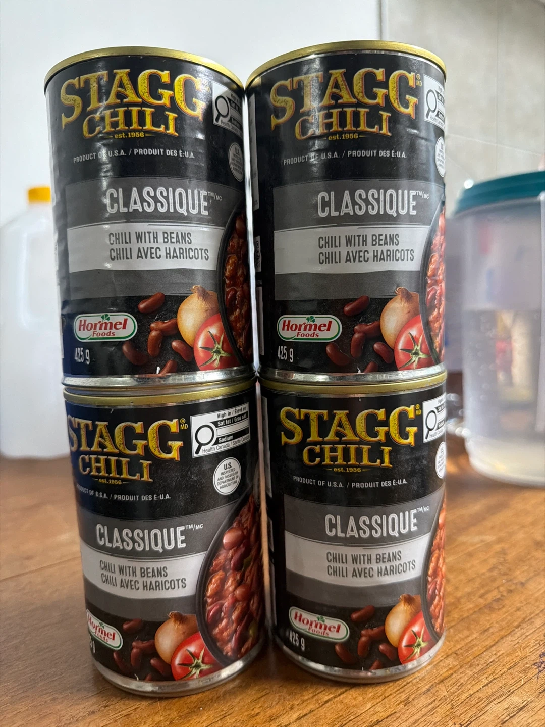Four cans of Stagg Classique Chili, chili with beans. Each can is 425g. Best by June 2028. Keep a can handy for a quick and satisfying meal!