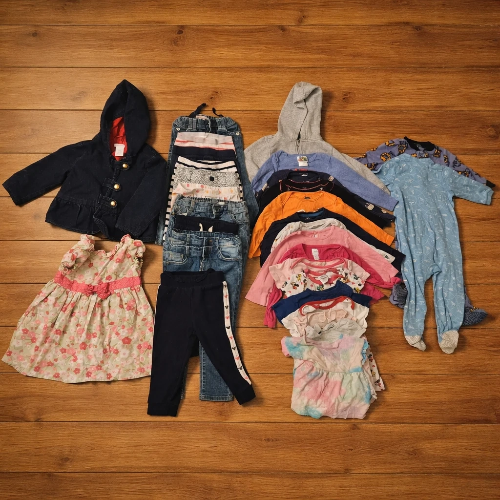 This is a bundle of assorted baby clothes including a dress, leggings, jeans, t-shirts, hoodies, and a onesie. Mostly girls' clothing with some unisex items. Sizes vary, suitable for infants and toddlers. Includes various brands.