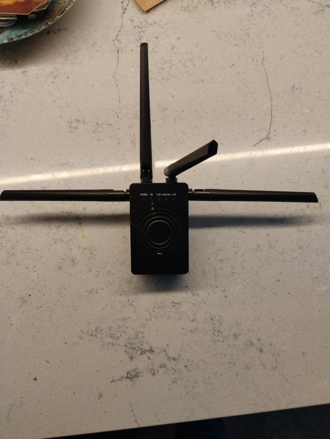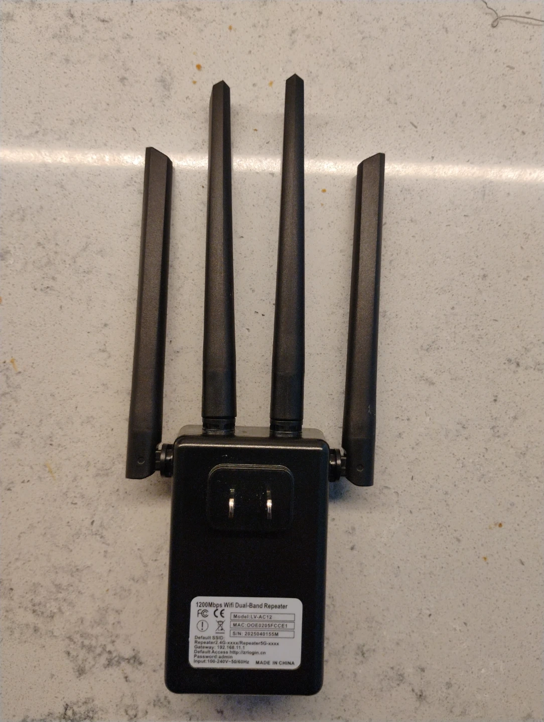 This is a black 1200Mbps dual-band WiFi extender and repeater. It connects to your existing network to boost Wi-Fi coverage. Setup is done via WPS or the default login.