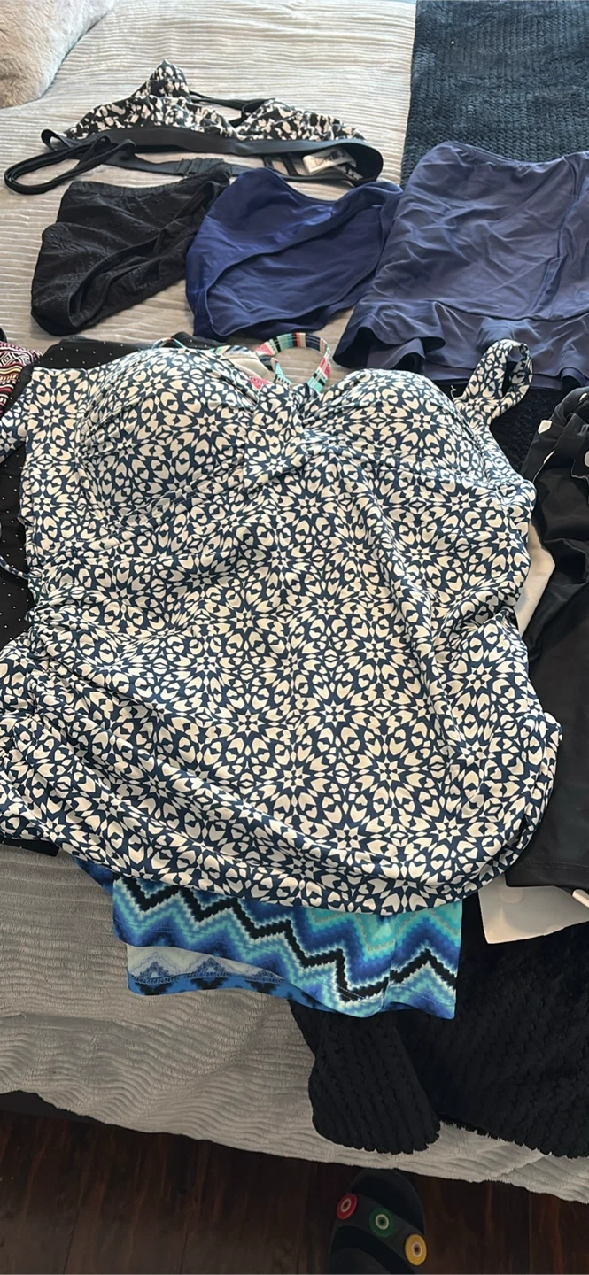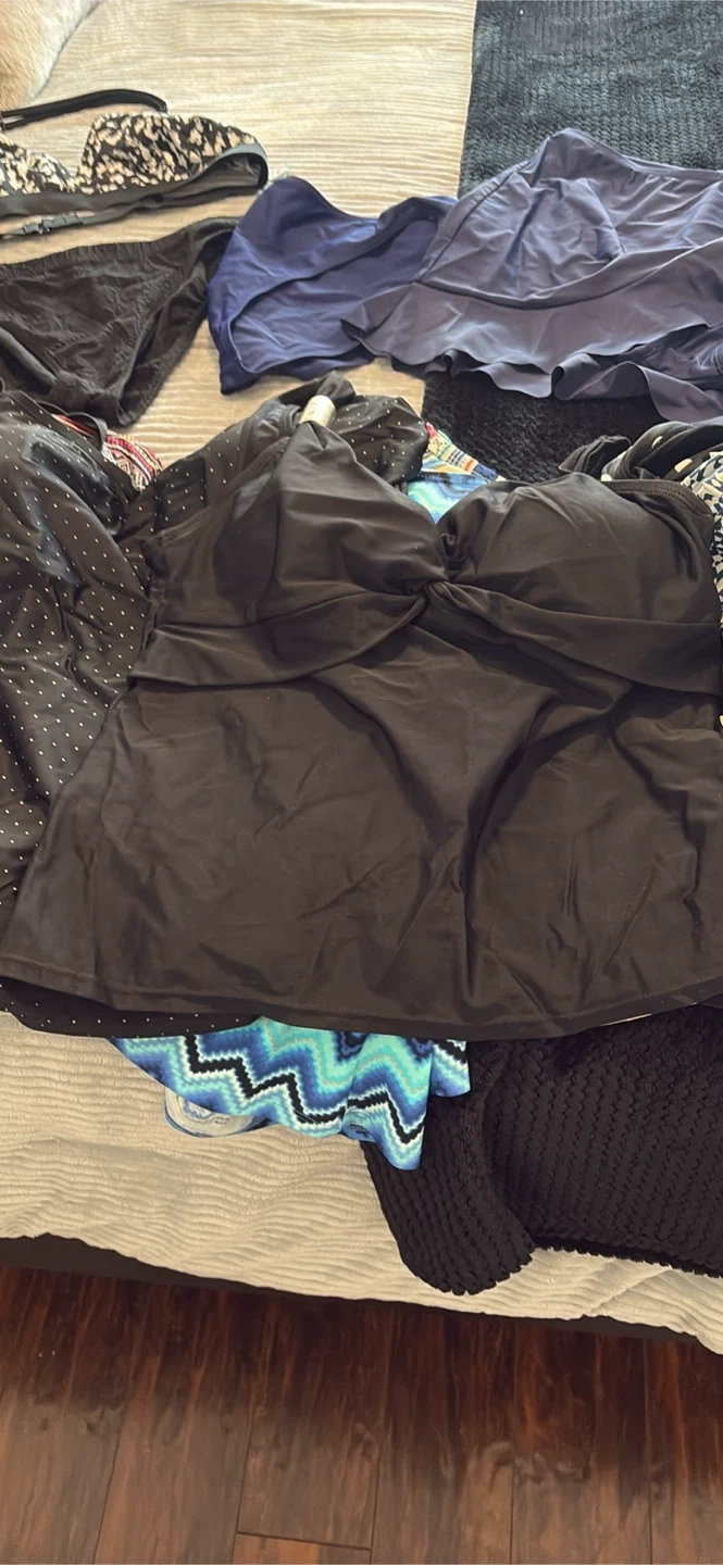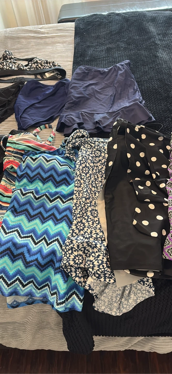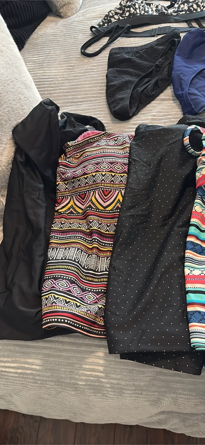 A collection of women's swimwear in various patterns and solid colours. Includes bikinis, one-pieces, and cover-ups. Fabric is a mix of nylon and spandex for a comfortable fit. Perfect for your next beach vacation or poolside lounging!
