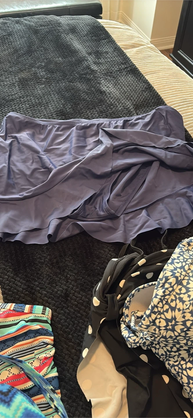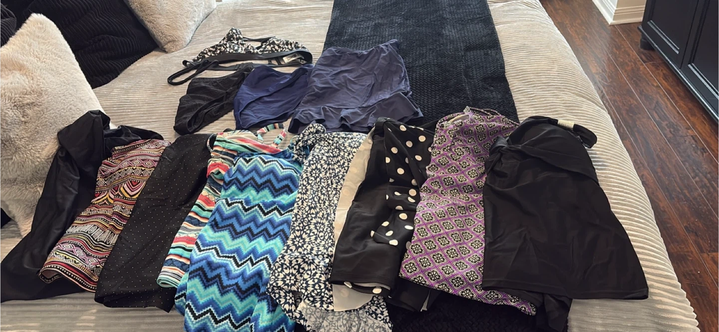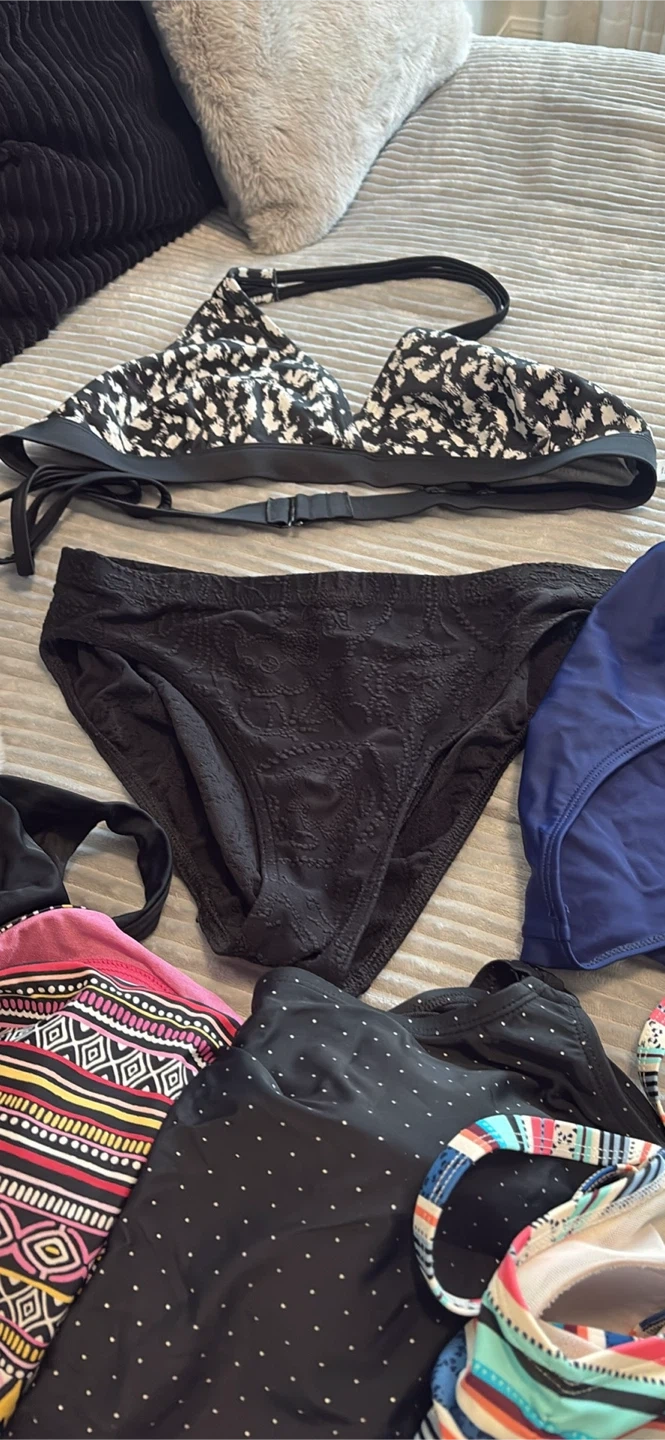 A collection of women's swimwear in various patterns and solid colours. Includes bikinis, one-pieces, and cover-ups. Fabric is a mix of nylon and spandex for a comfortable fit. Perfect for your next beach vacation or poolside lounging!