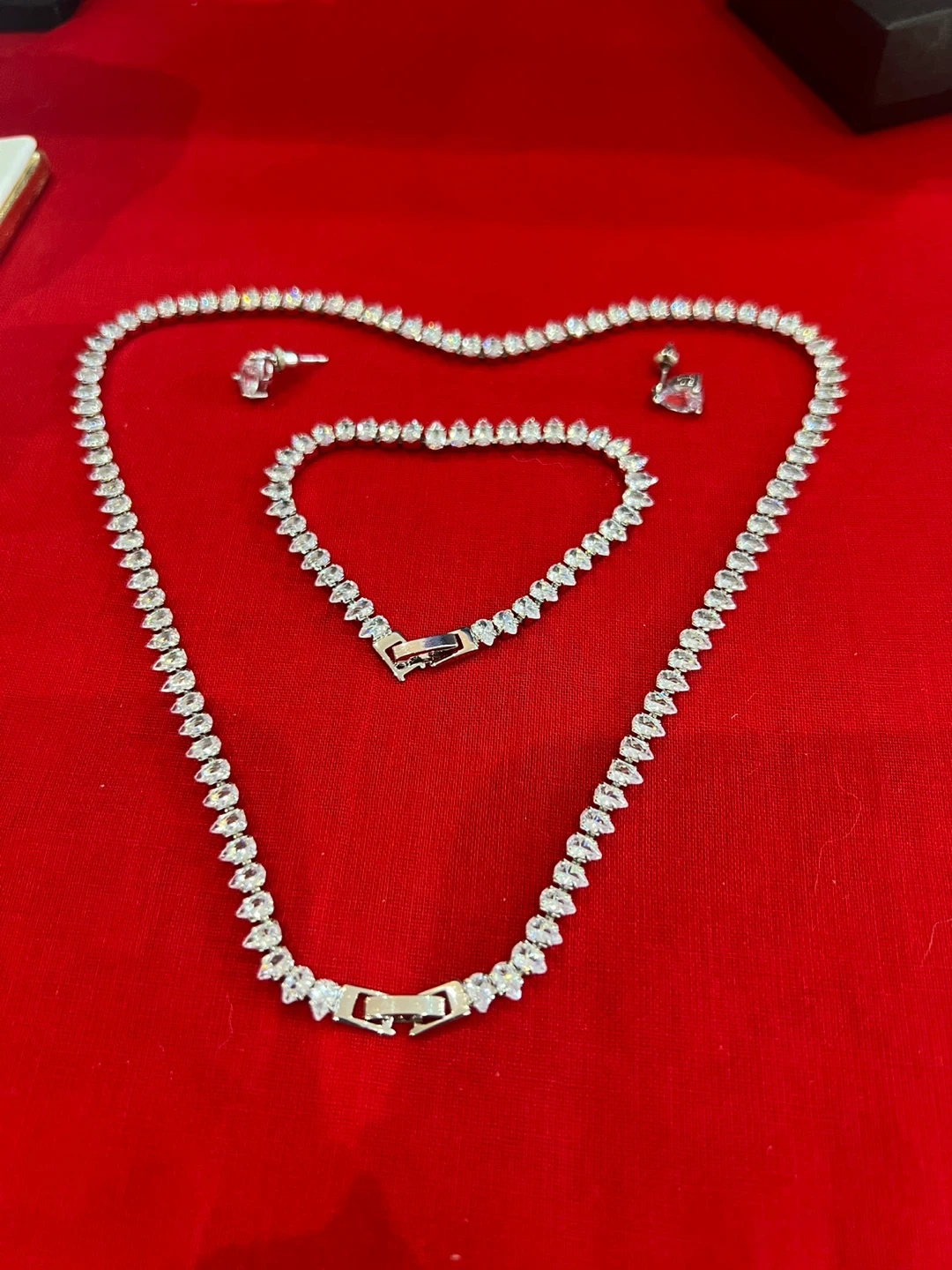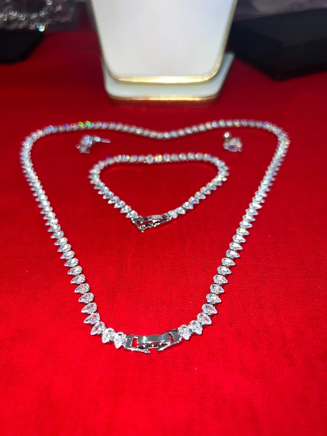 This sparkly tenis set includes a necklace, bracelet, and stud earrings. All pieces are silver-toned and encrusted with clear, teardrop-shaped stones. They feature secure clasp closures. It's perfect for adding some glam to your look!