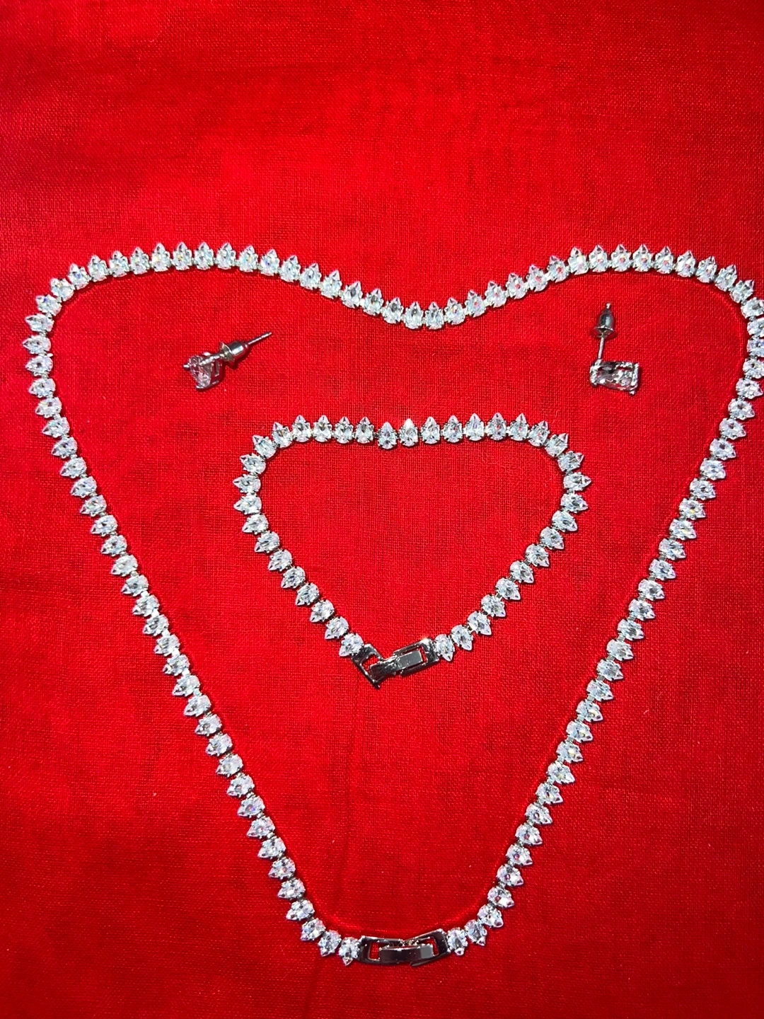 This sparkly tenis set includes a necklace, bracelet, and stud earrings. All pieces are silver-toned and encrusted with clear, teardrop-shaped stones. They feature secure clasp closures. It's perfect for adding some glam to your look!