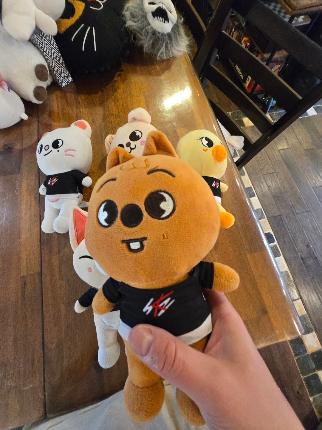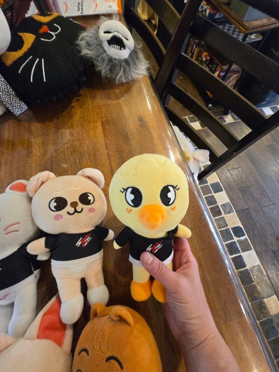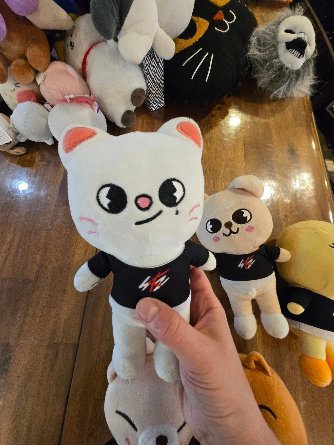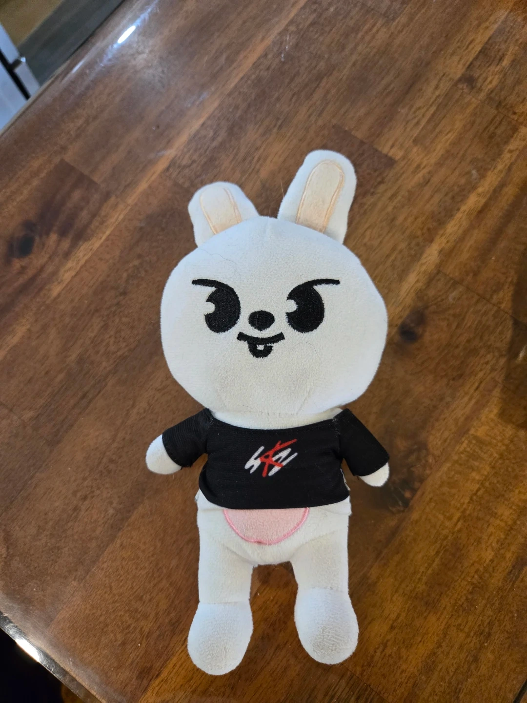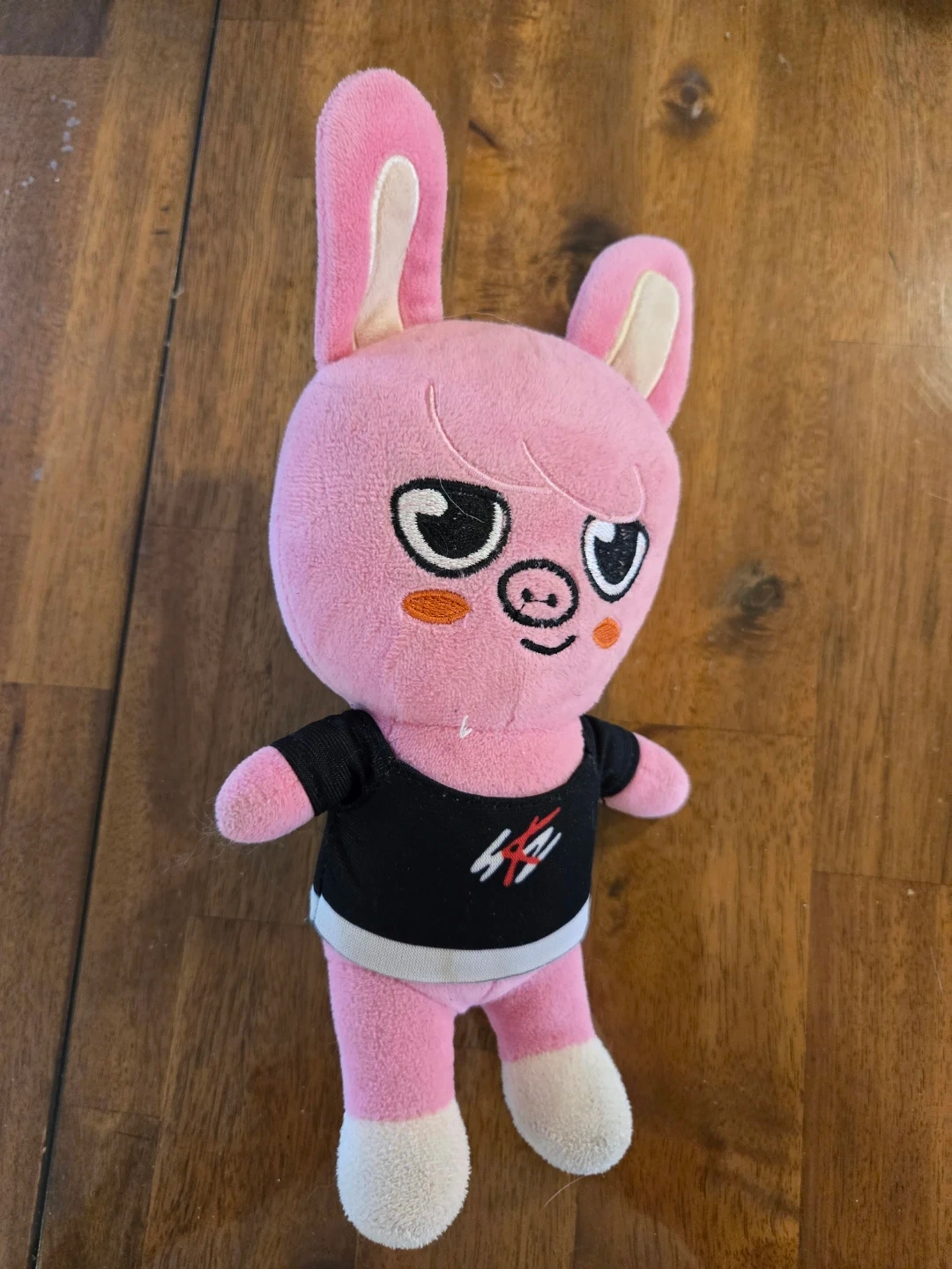 This is a white SKZOO plush toy, featuring a bunny character. It's wearing a black shirt with a red and white logo. Soft and cuddly, it's perfect for any fan! 55 for all or 10 each