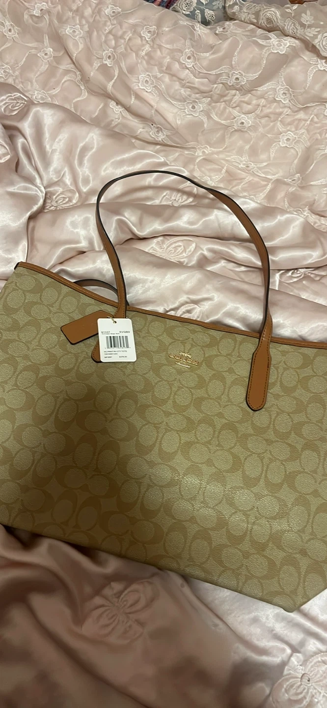 This Coach City Tote Bag is made with their signature print PVC material and features tan leather trim. It's a practical size for everyday use. Comes with original tag.