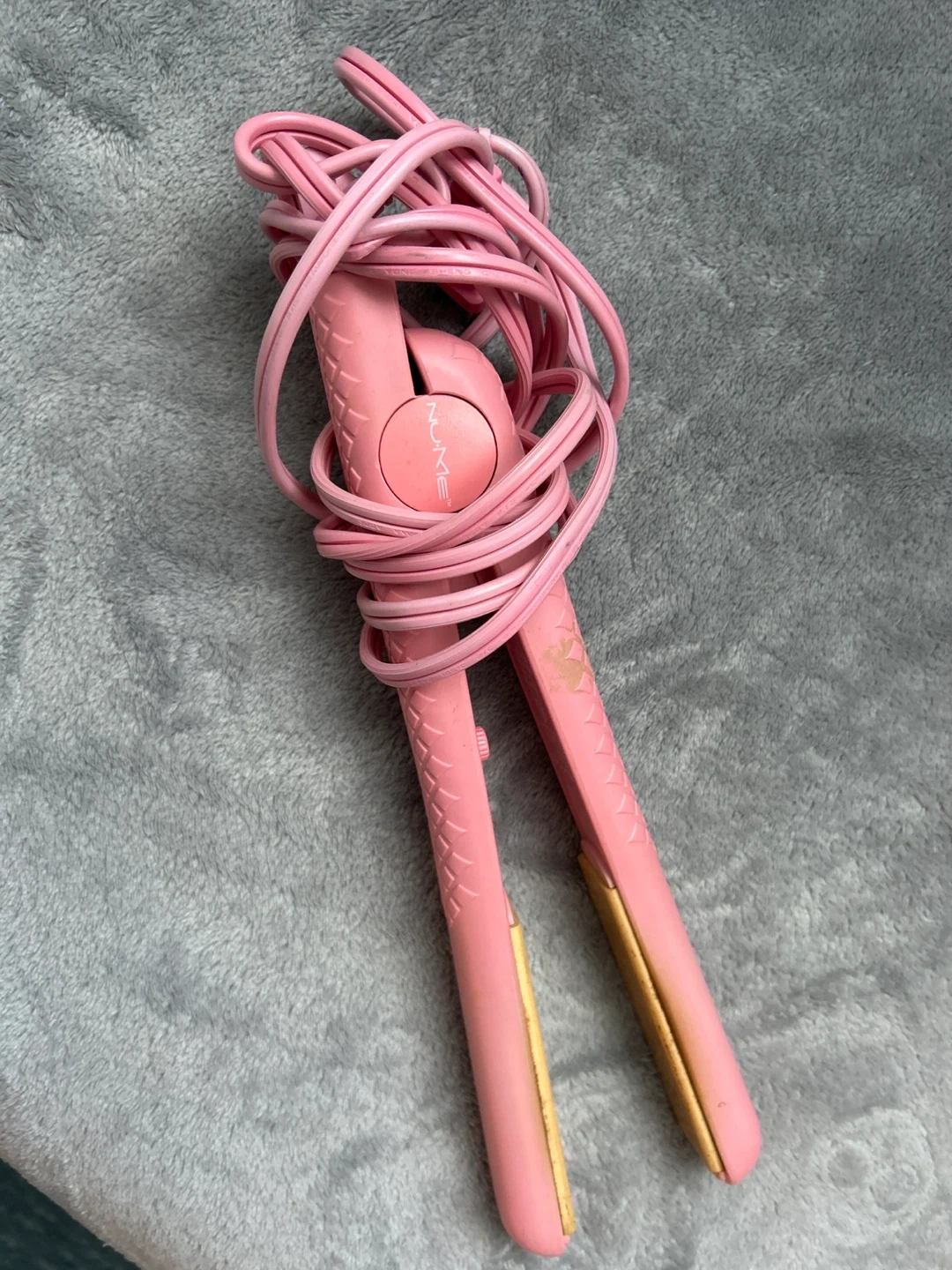 This is a NuMe pink hair straightener. It's a compact size for easy styling. Ceramic plates heat up quickly for efficient use. I’ve been using it but still works great