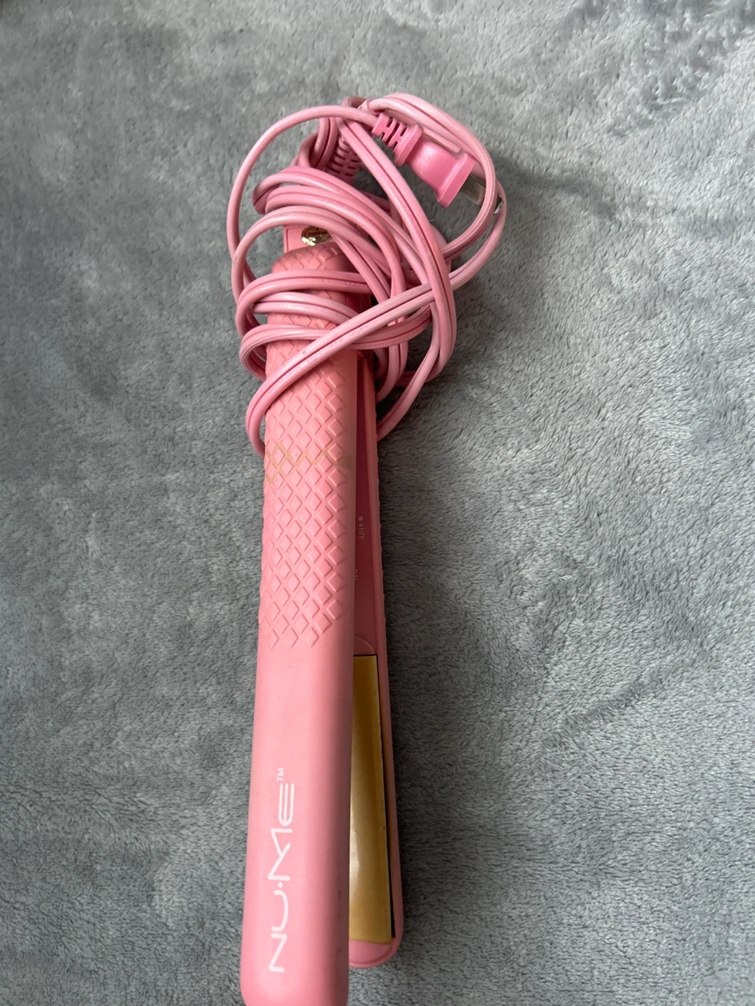 This is a NuMe pink hair straightener. It's a compact size for easy styling. Ceramic plates heat up quickly for efficient use. I’ve been using it but still works great