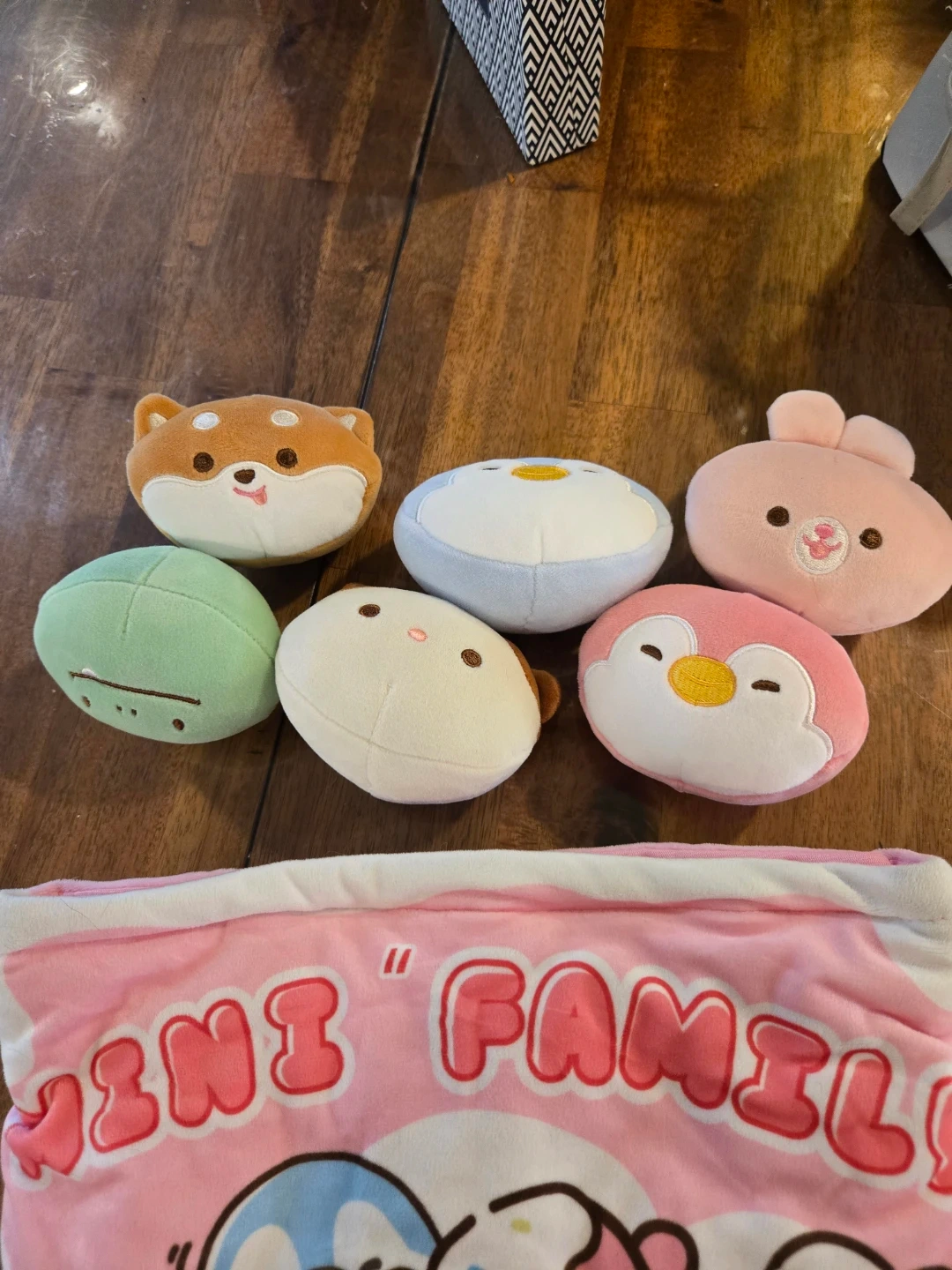 This set includes a sweet candy-themed pouch and multiple small plushies like a penguin, a bunny, and animal characters. They're soft and perfect for collecting or decorating a space.