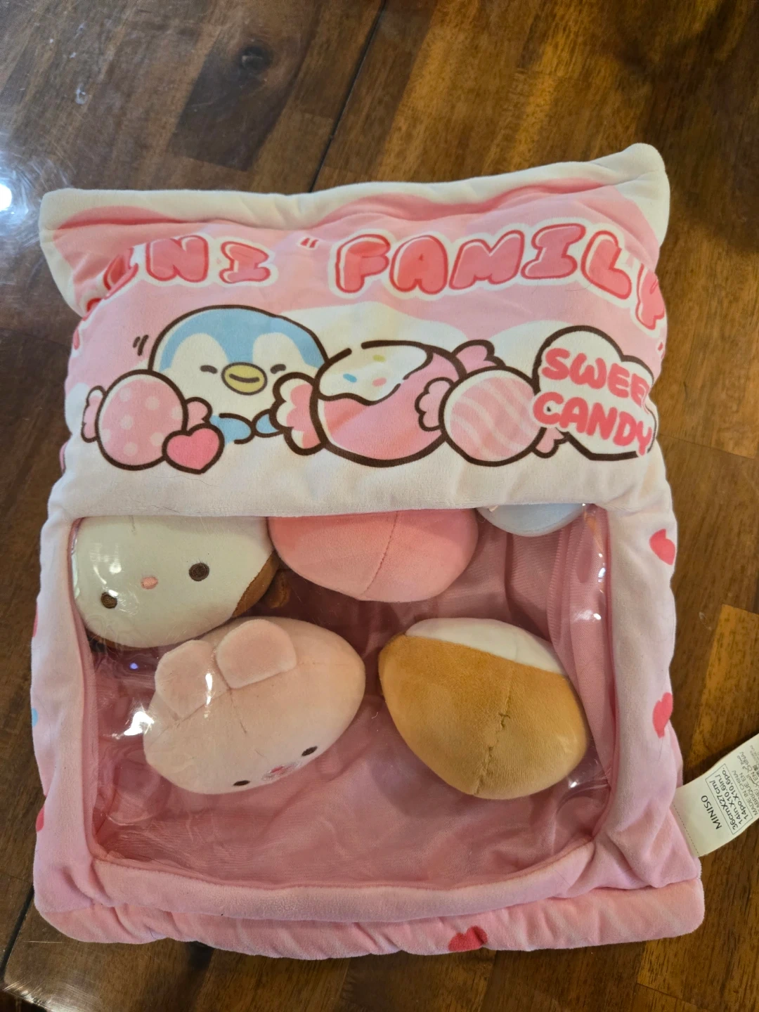 This set includes a sweet candy-themed pouch and multiple small plushies like a penguin, a bunny, and animal characters. They're soft and perfect for collecting or decorating a space.