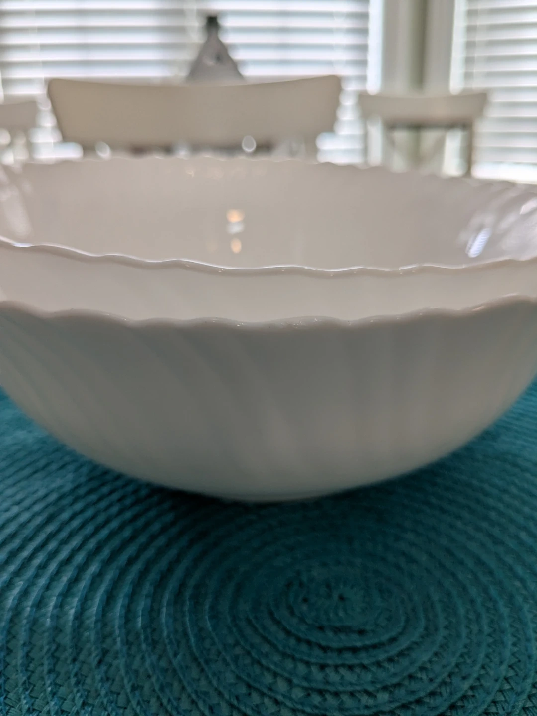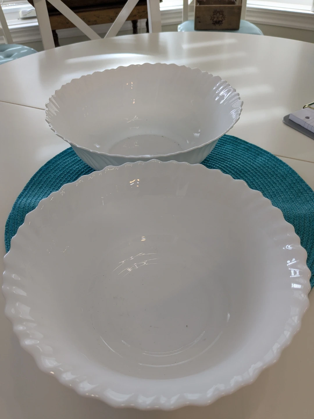 Two white serving bowls with a swirl design and fluted rims. They're made of durable material. These bowls are great for serving salads or side dishes at family dinners. They're a nice addition to any kitchen!
