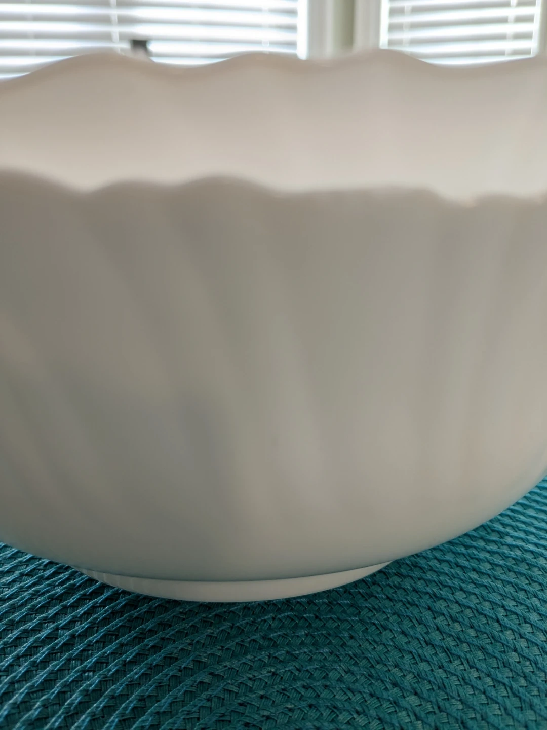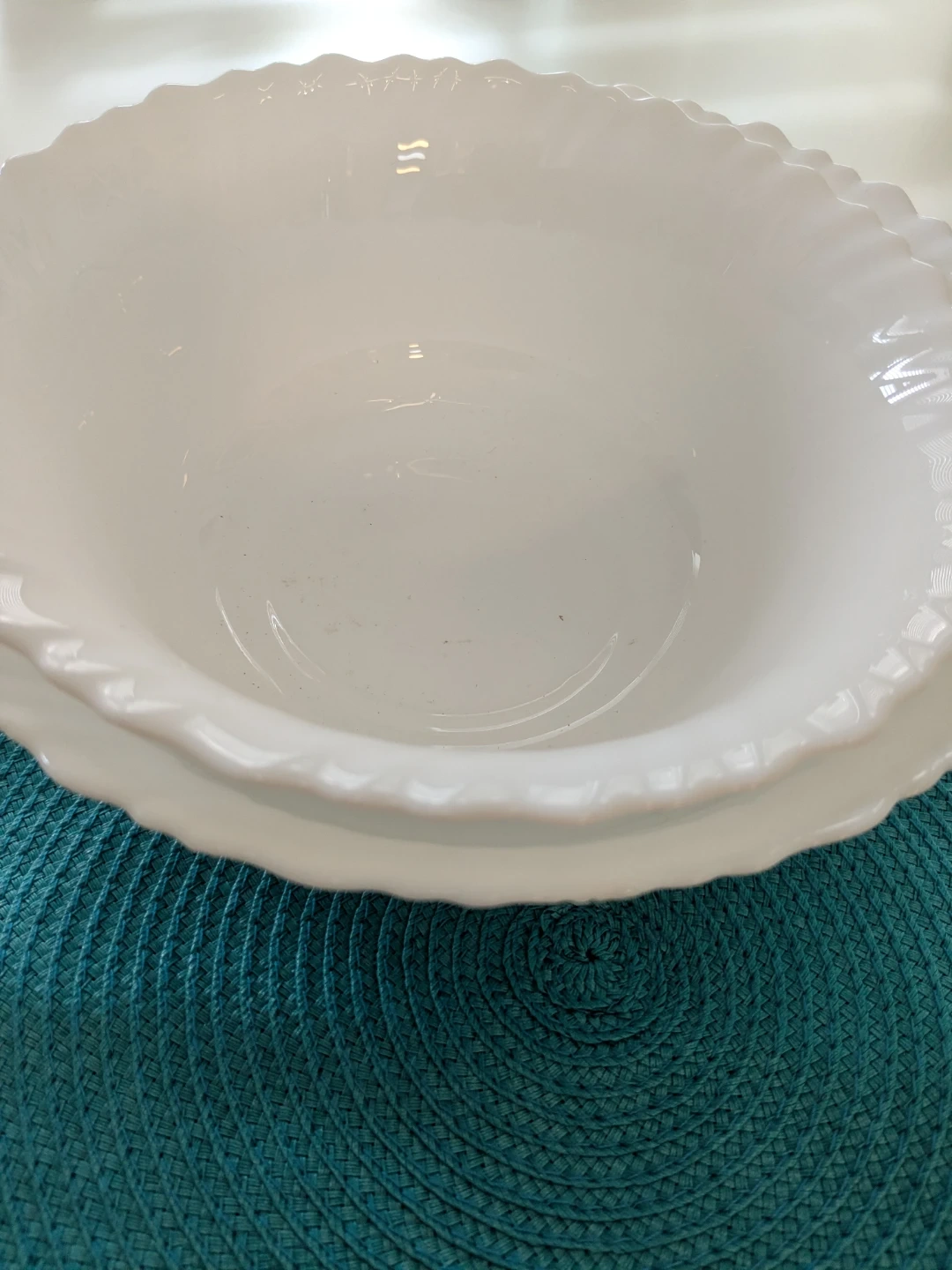 Two white serving bowls with a swirl design and fluted rims. They're made of durable material. These bowls are great for serving salads or side dishes at family dinners. They're a nice addition to any kitchen!