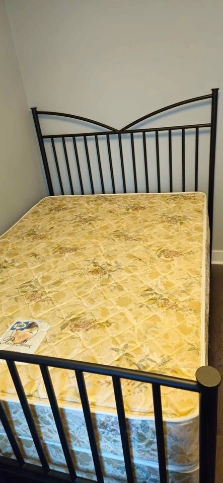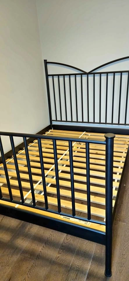 IKEA Halden black metal bed frame, includes slats, all hardware, and instruction manual. Bed is in perfect condition. Also included is a Sealy Posture Premier mattress and box spring. The mattress has some damage but would be fine with a memory foam topper. Pick up only. Smoke free, pet free home.