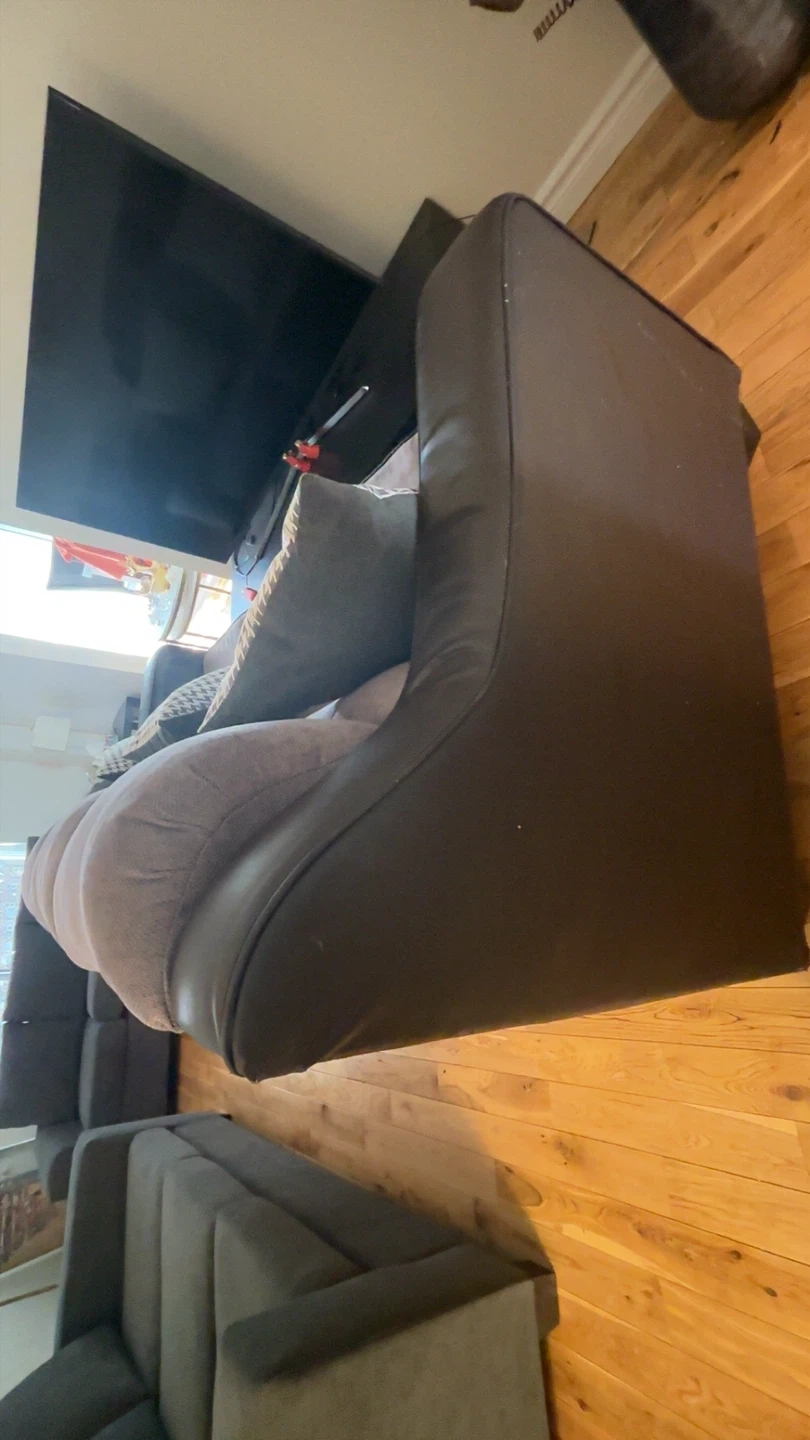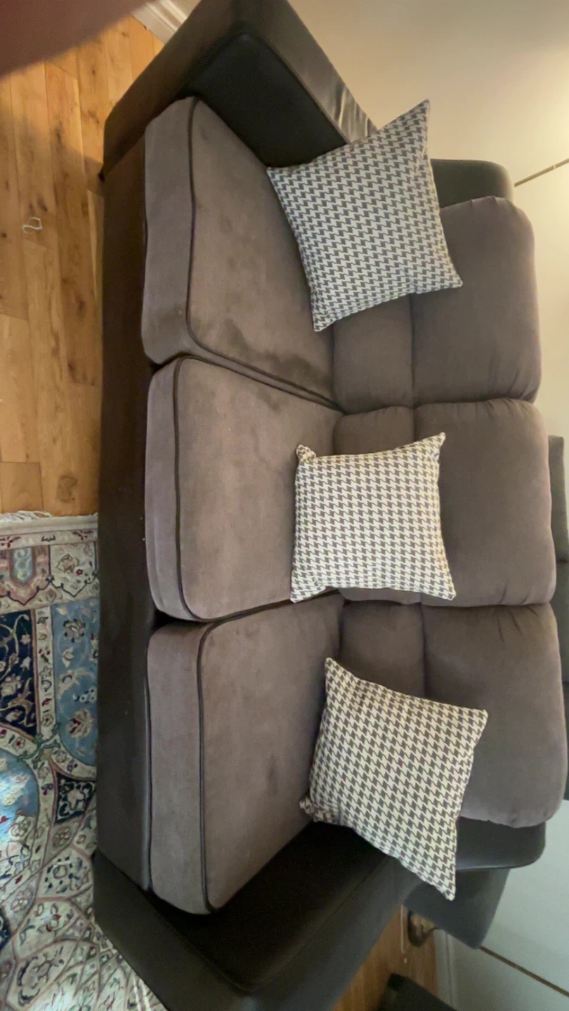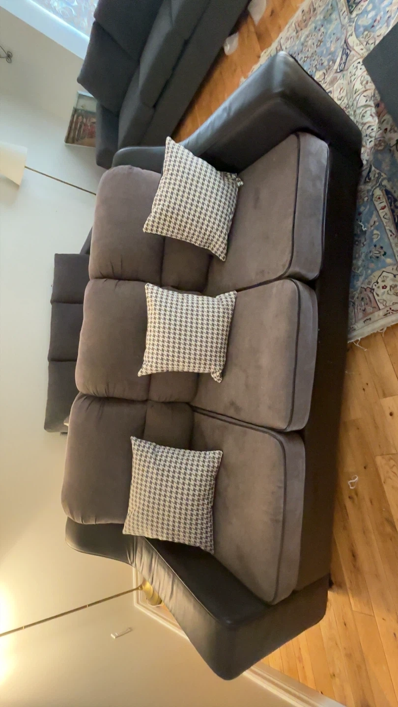 Comfortable three-seater sectional sofa with tufted grey fabric cushions and dark brown faux leather base. Small stains easy to fix on sofa, decent condition, bought for 800, need gone asap. PRICE NEGOTIABLE